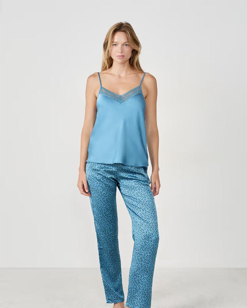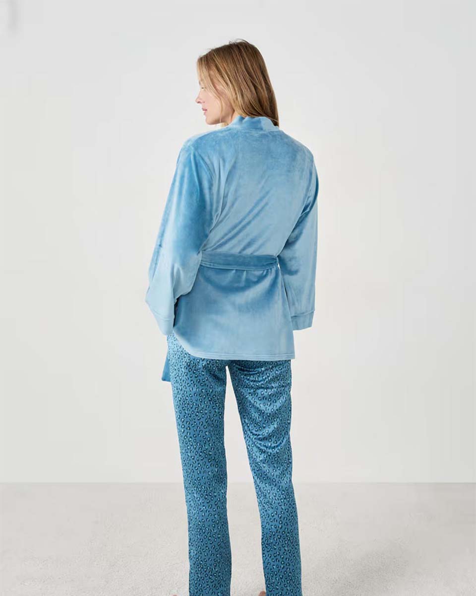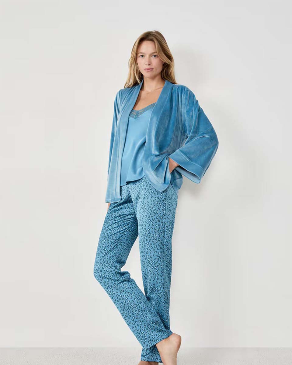 “Perfect for soft and cosy nights, this pyjama set includes a camisole, trousers and a robe.With a satin finish, this camisole with scalloped edges pairs with the leopard print trousers.They are enhanced by a belted velvet robe.”