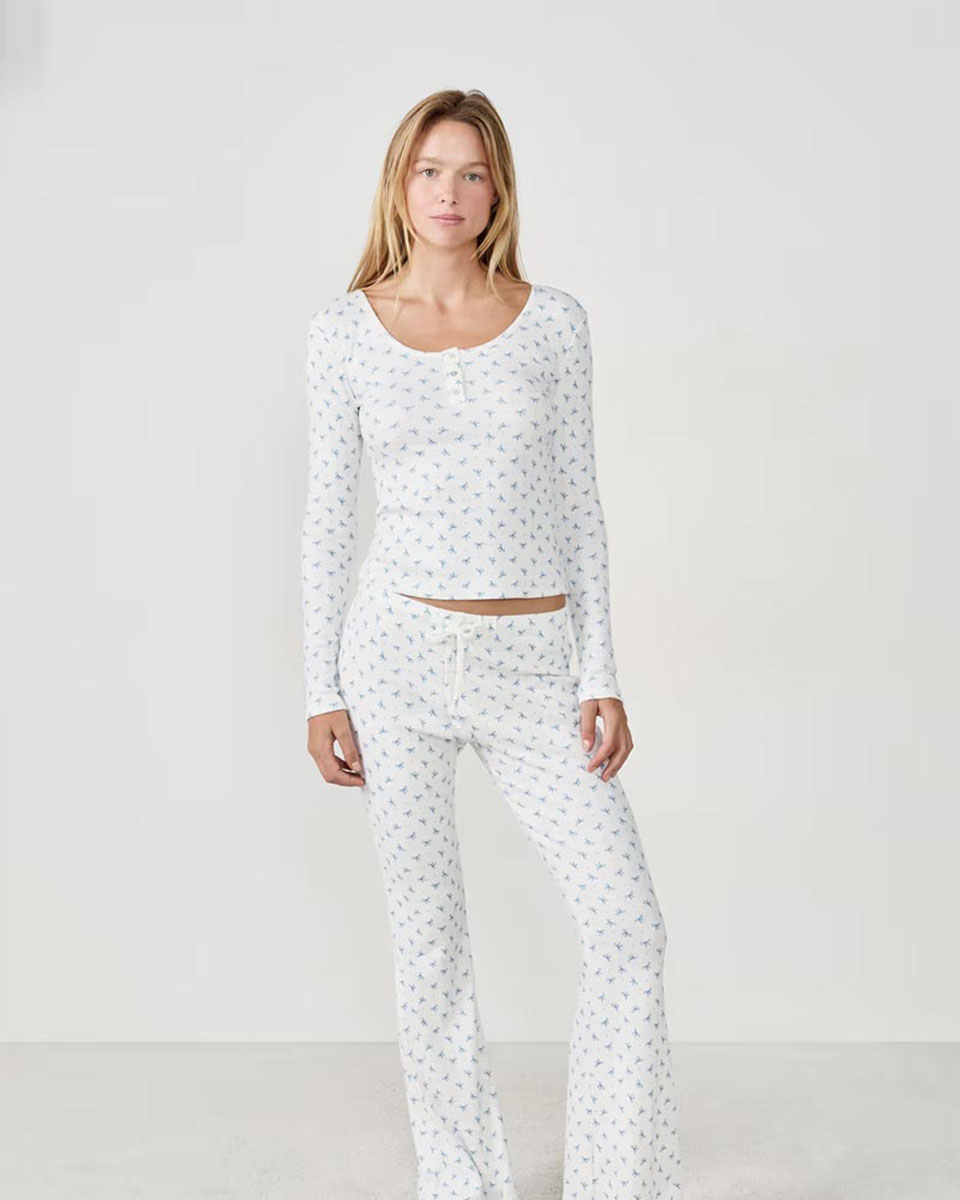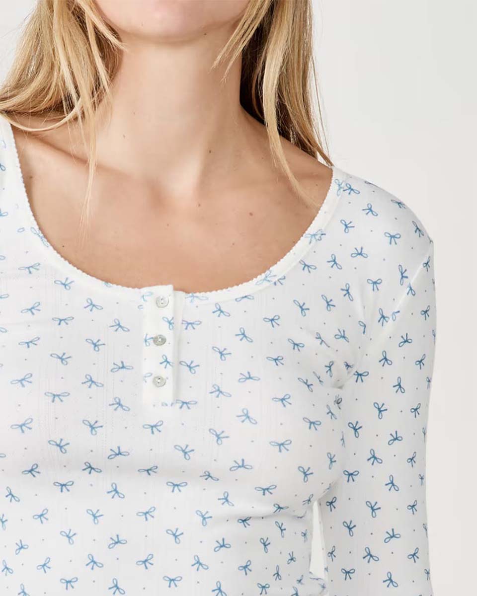 “Made from soft material, this pyjama T-shirt opts for a close-fitting cut. It pairs with the coordinating trousers.”