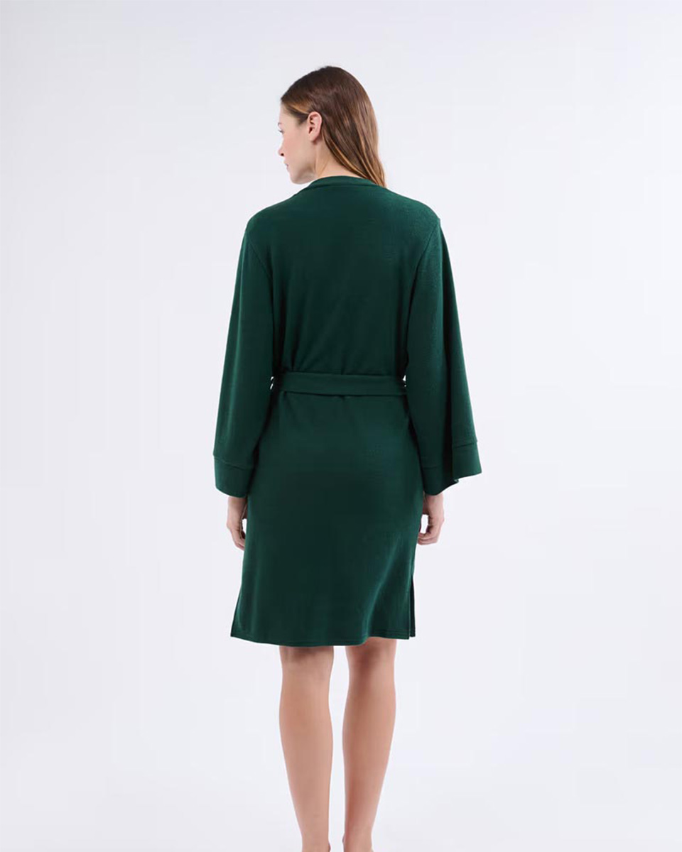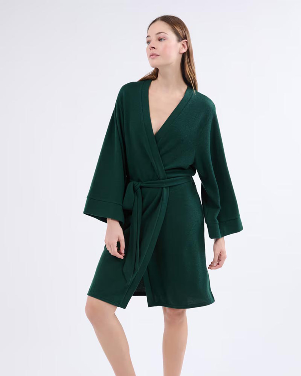 “Ideal for cozy nights, this long-sleeved robe has a velvety feel. It ties at the waist for a structured silhouette.”