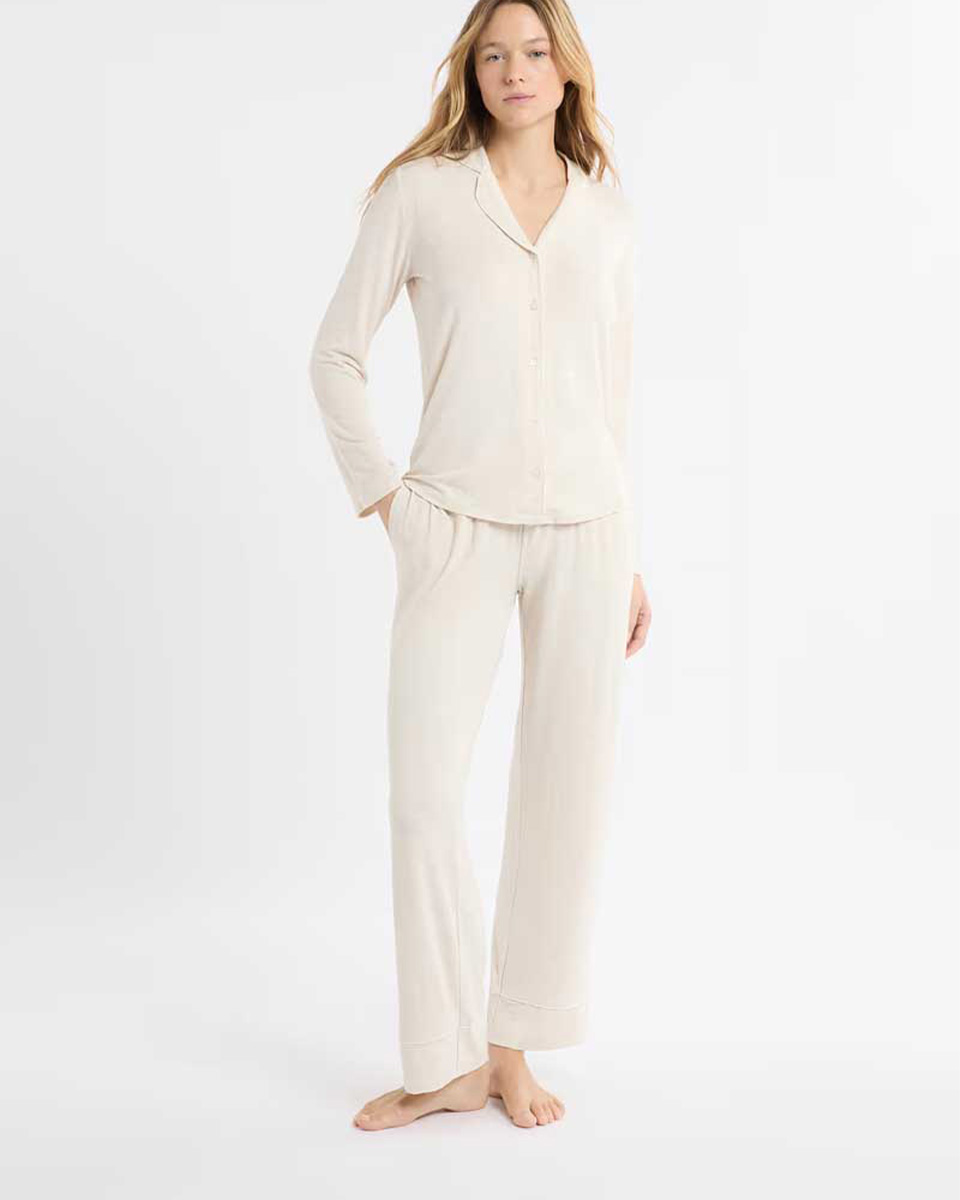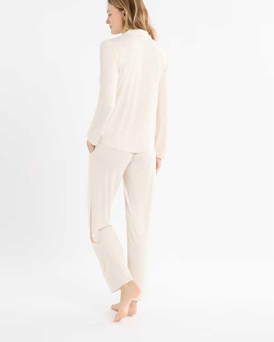 “This pyjama set includes pants and a long-sleeved shirt.Made from soft fabric, this set features a loose, flowing cut enhanced with a contrasting solid trim”