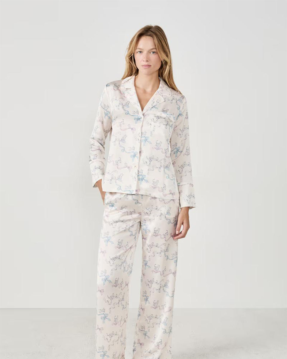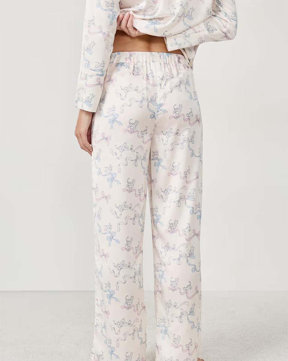 “Perfect for gentle nights, these pyjama trousers offer a satin finish and bow print.”