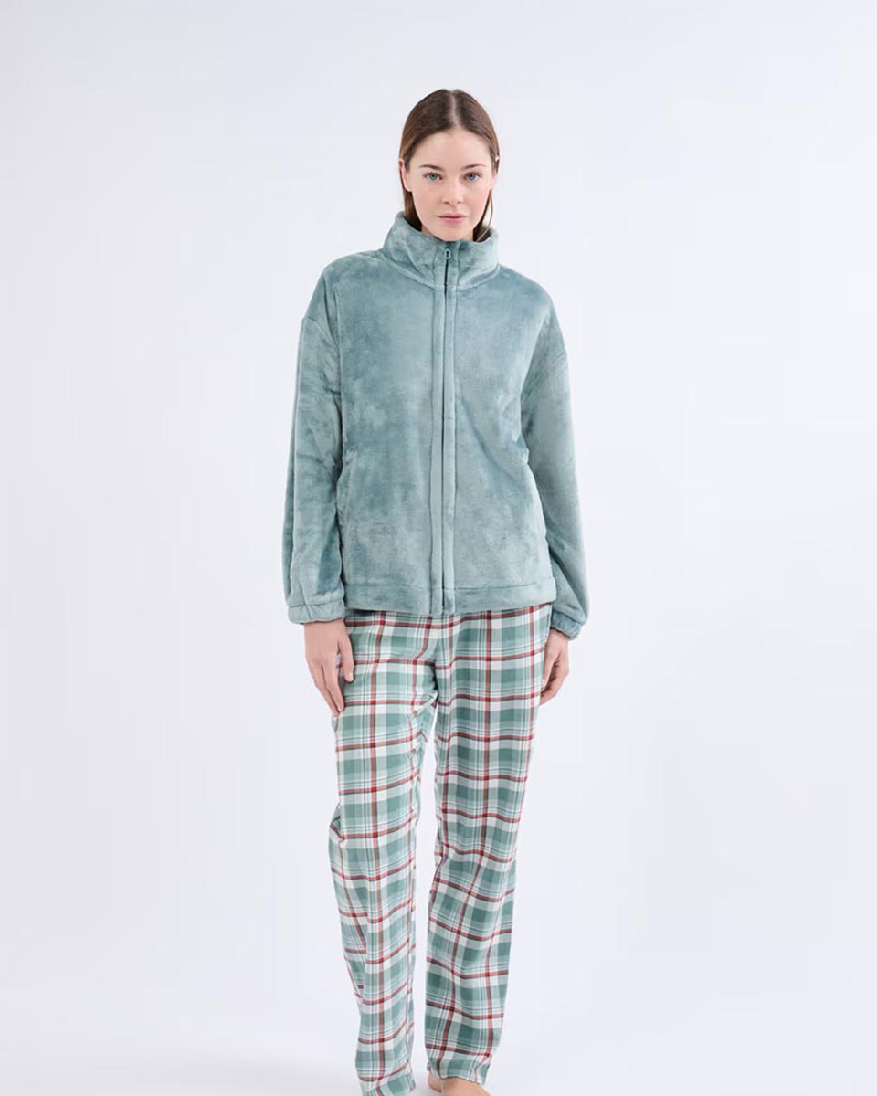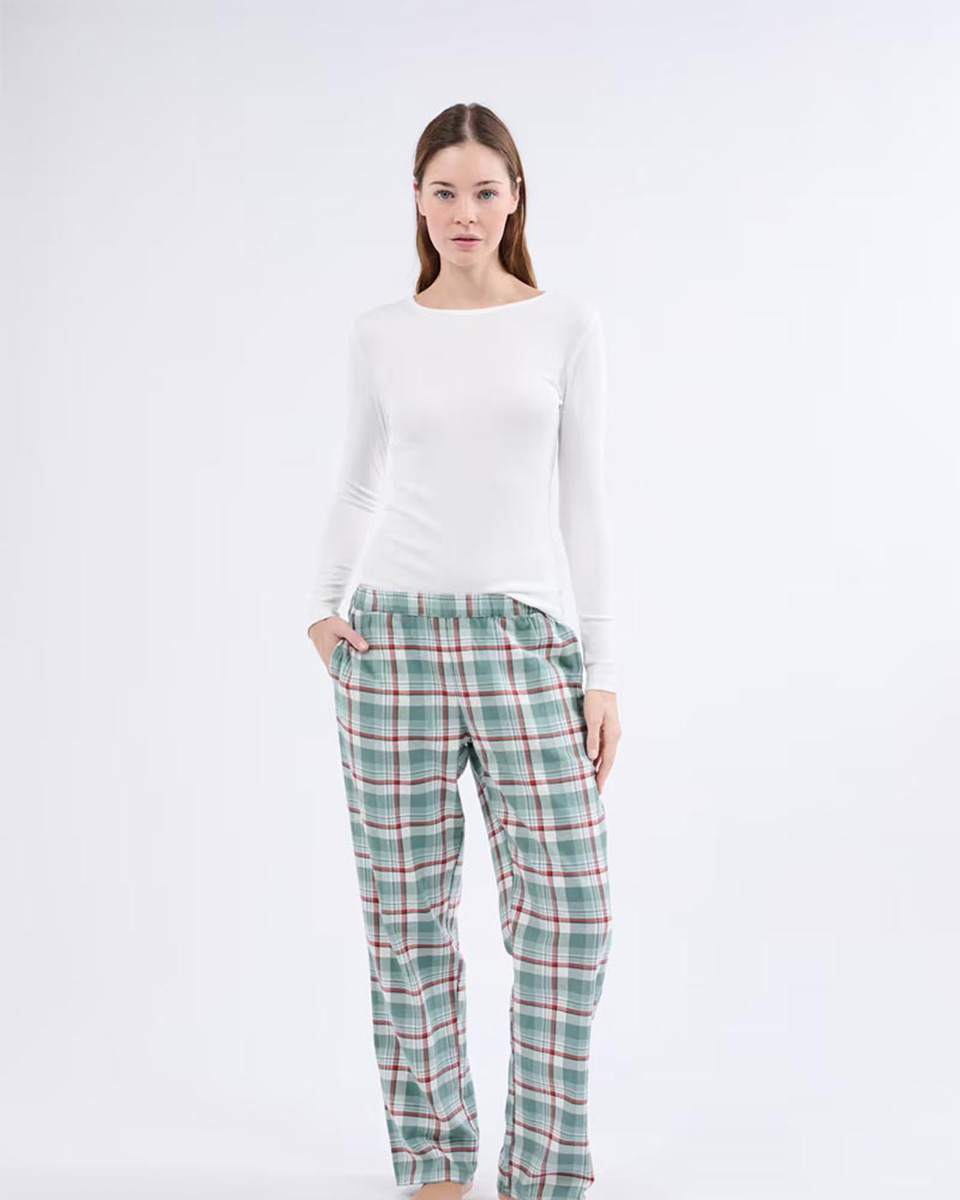 “Ideal as a gift or a treat for yourself, this three-piece pyjama set features a plaid print on the trousers. It can be worn with the matching t-shirt and jacket.”