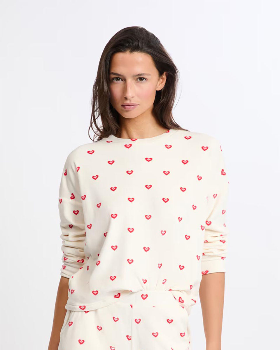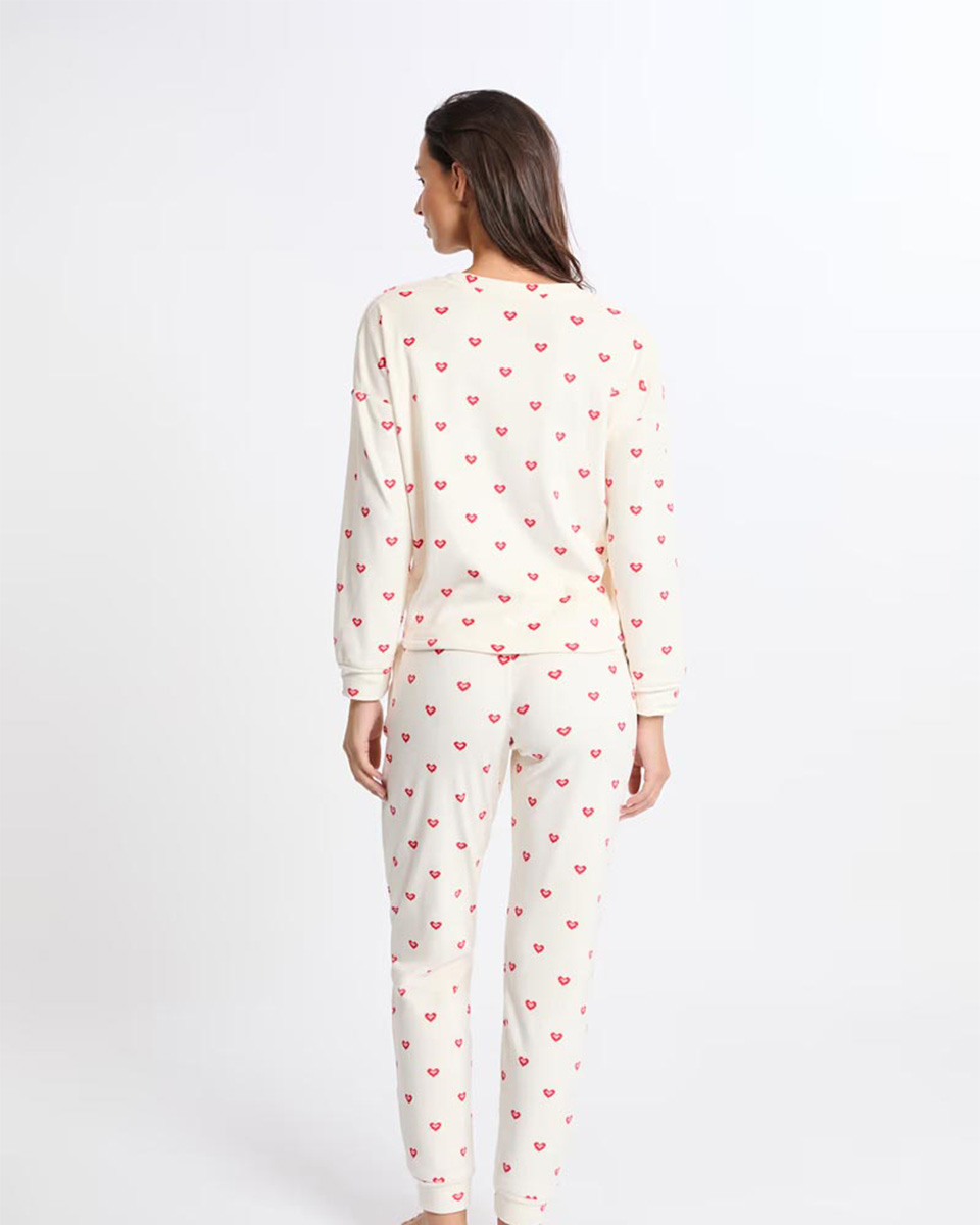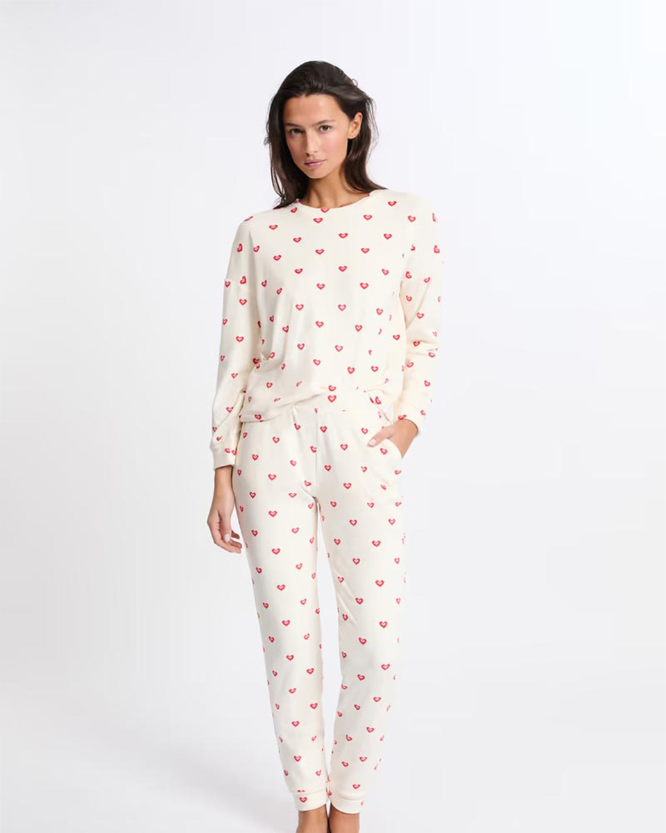 “Ultra-soft and comfortable, this 2-piece pajama set features a velvet effect and a heart print. It includes a long-sleeved, round-neck sweater and wide-legged pants.”
