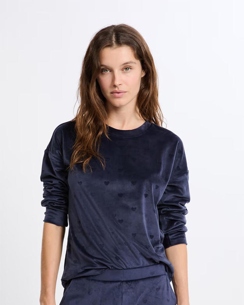 “Ultra-soft and comfortable, this 2-piece pajama set features a velvet effect and a heart print. It includes a long-sleeved, round-neck sweater and wide-legged pants.”