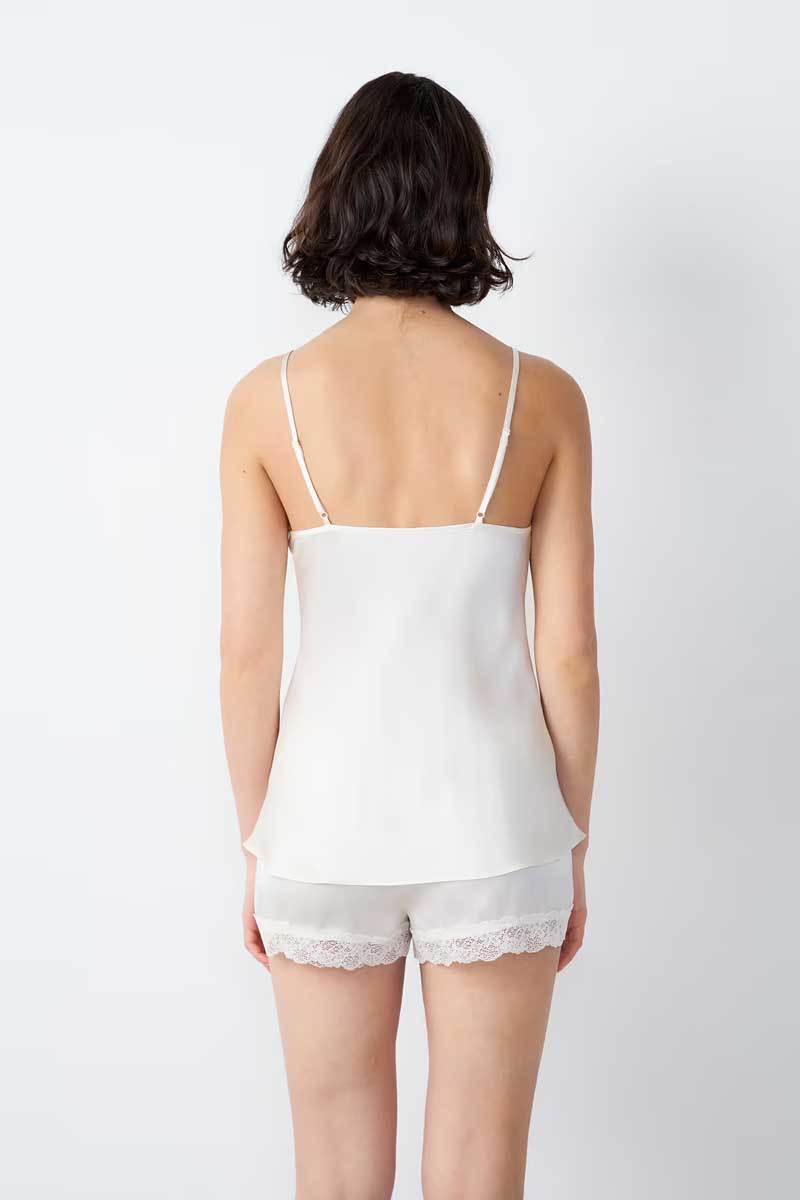 “A precious and infinitely soft material for very chic nights. Succumb to our 100% natural silk collection, with exceptional thermal properties: it retains warmth in winter and keeps cool in summer.A divine nightdress enhanced with floral lace, to be worn at night, but also during the day under a maxi knit cardigan.”
