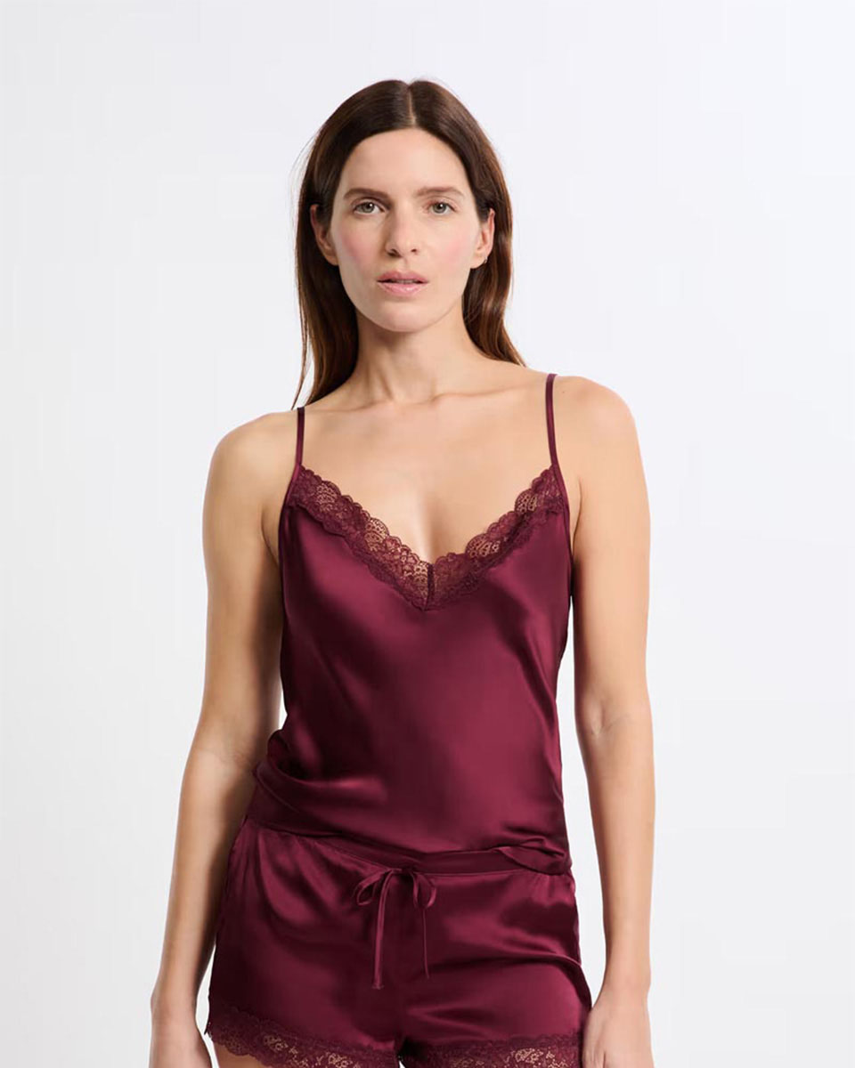 “A precious and infinitely soft fabric for elegant nights. Indulge in our 100% natural silk collection, boasting exceptional thermal properties: it retains warmth in winter and keeps you cool in summer.Subtly adorned with floral lace, these silk shorts are worn with their matching camisole.”