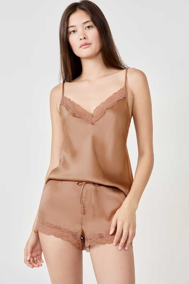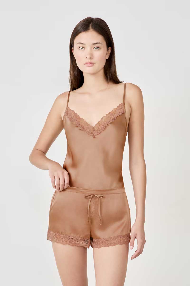 “A precious and infinitely soft material for very chic nights. Succumb to our 100% natural silk collection, with exceptional thermal properties: it retains warmth in winter and keeps you cool in summer.Delicately enhanced with floral lace, these silk shorts can be worn as a total look with the matching camisole”