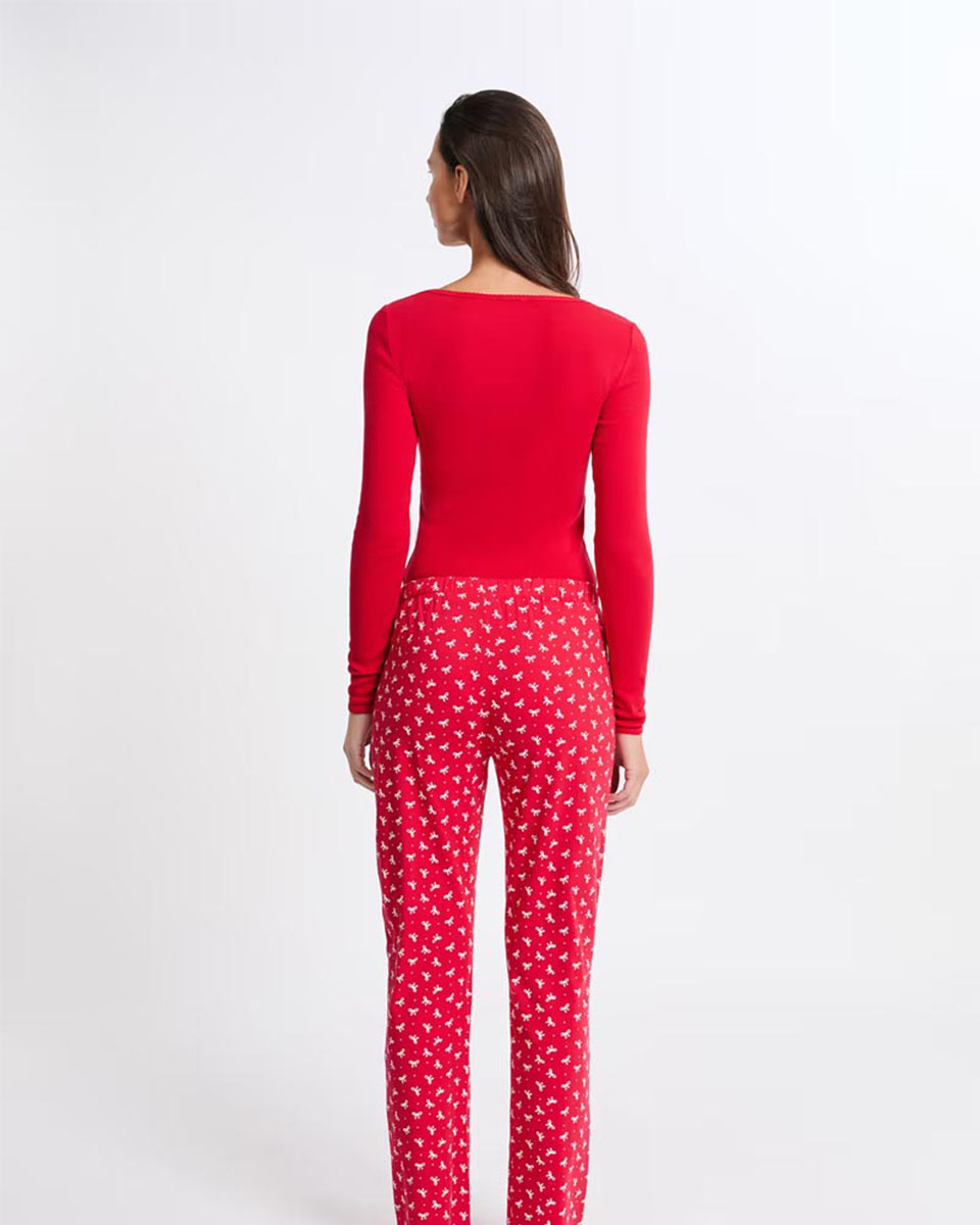 “Ideal as a gift or a treat for yourself, this gift set contains a two-piece pyjama set.It includes a long-sleeved V-neck t-shirt and cotton trousers with a bow print.”