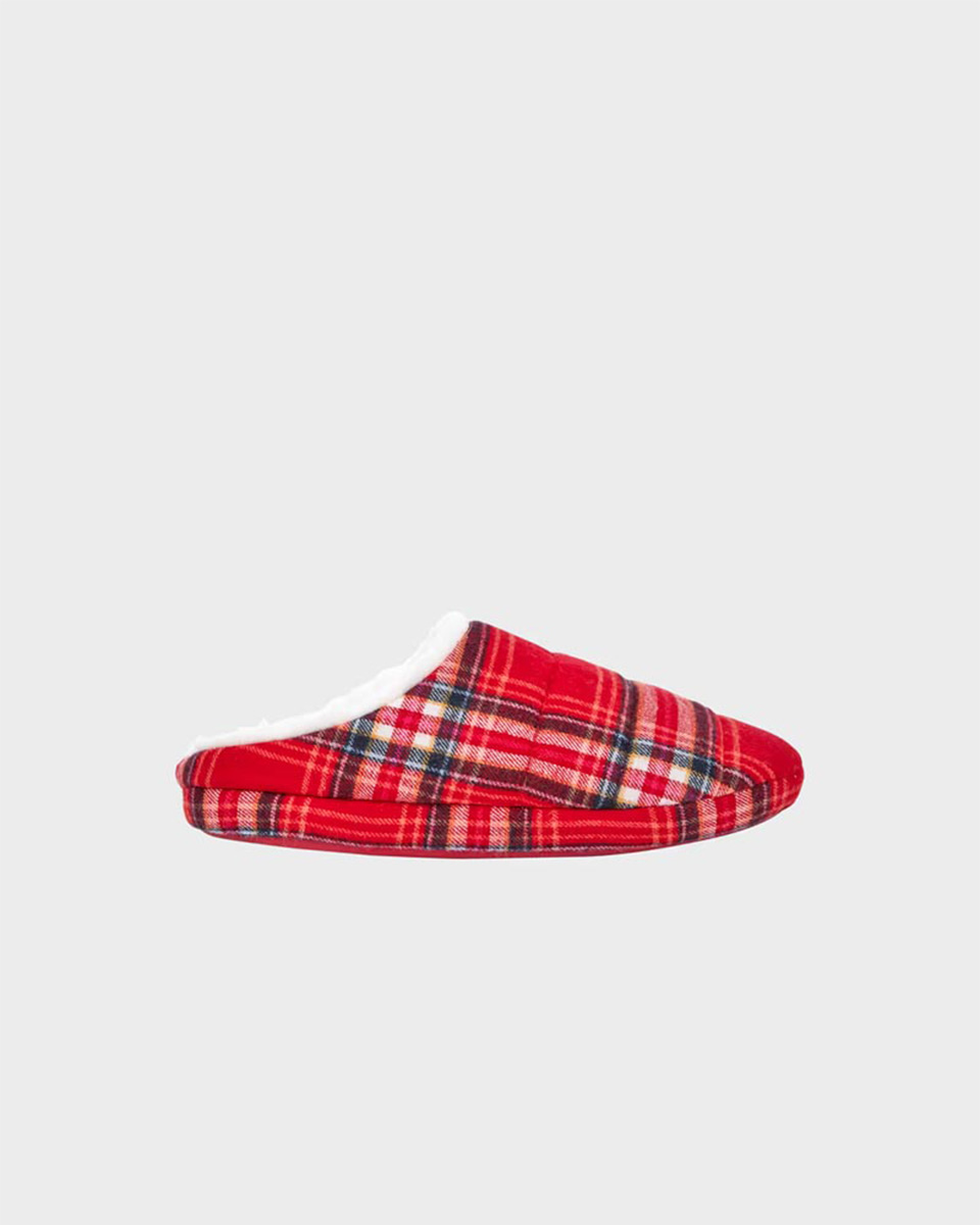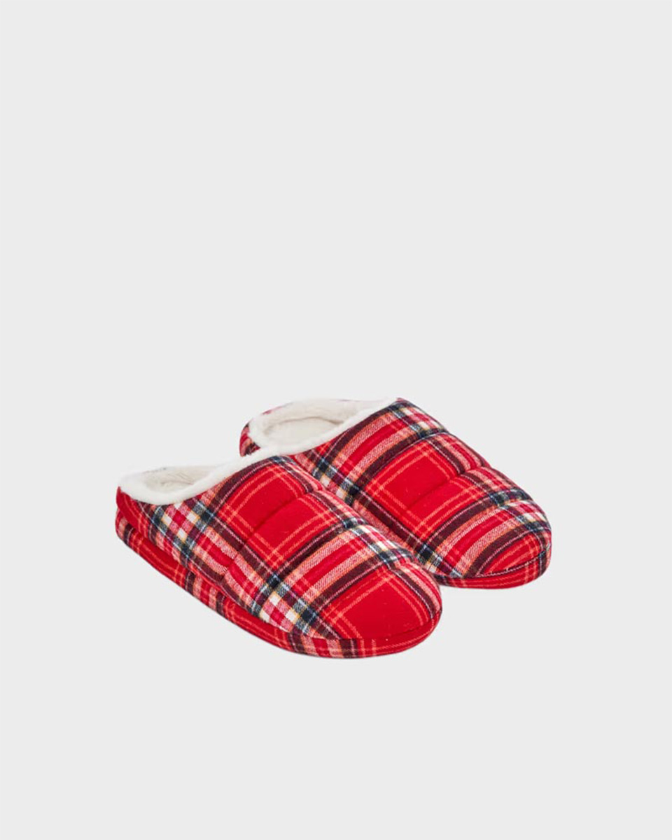 “Featuring this season’s star print, these mules are dressed in checks and lined with faux fur. Perfect for staying warm in style!”