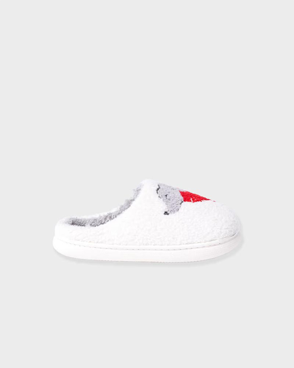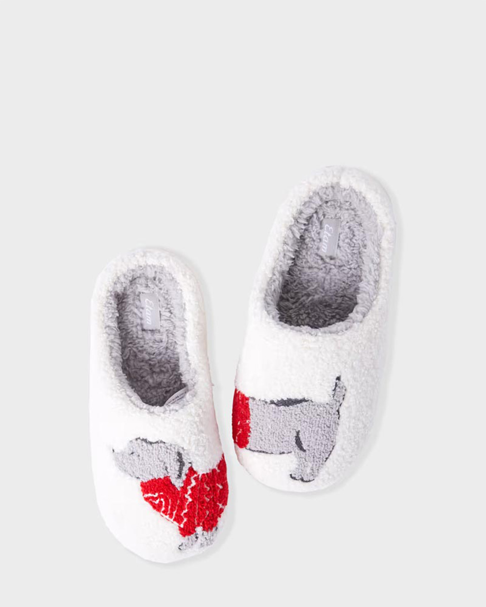 “Ultra soft on the inside, these faux fur mules are enhanced with a dog motif at the toe.”