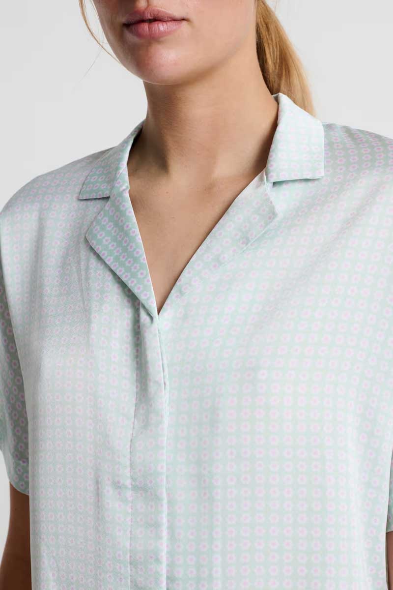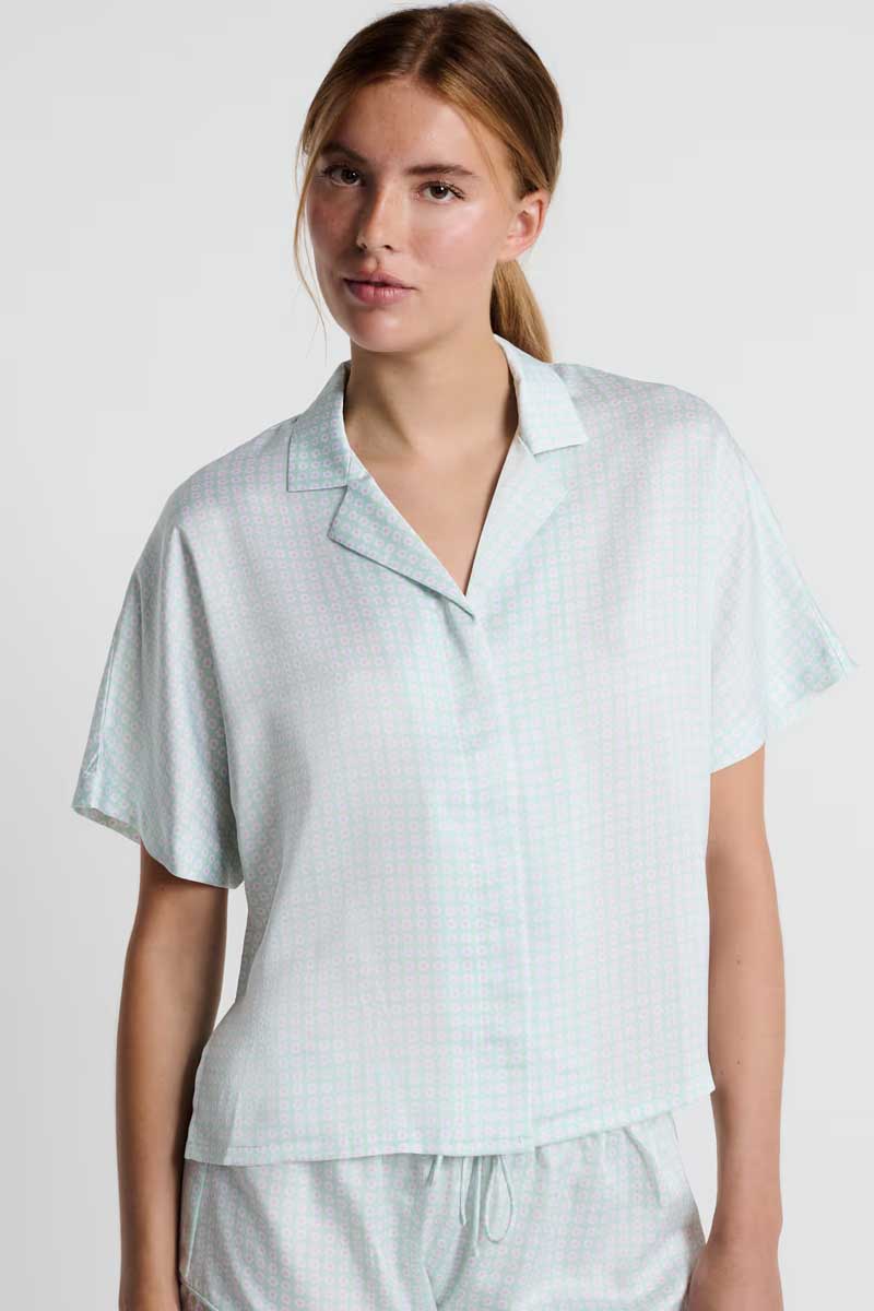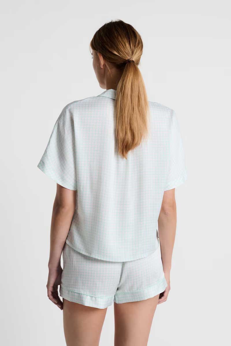 “The floral look is back with this printed pajama shirt. Its shirt collar, short sleeves, and button closure make it the perfect ally for your sweet nights.”