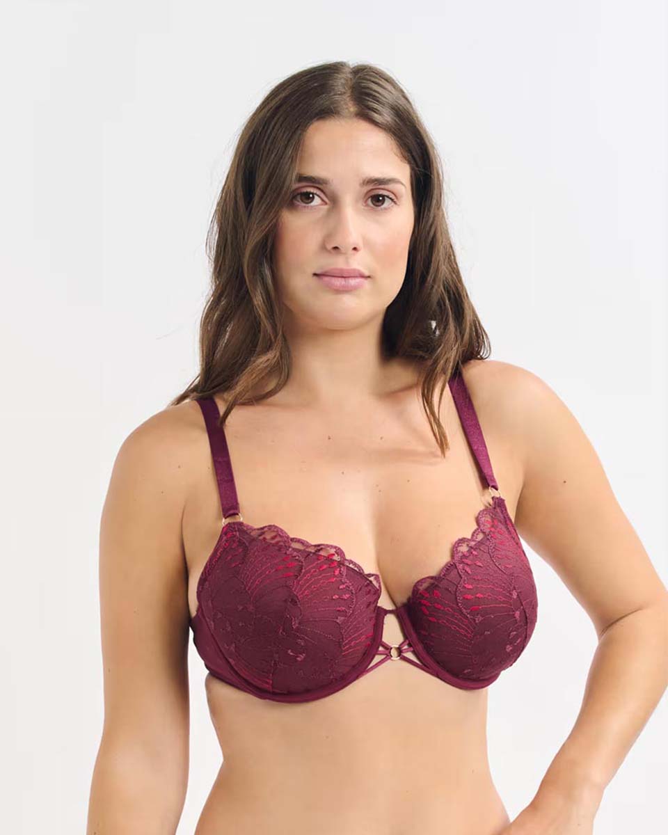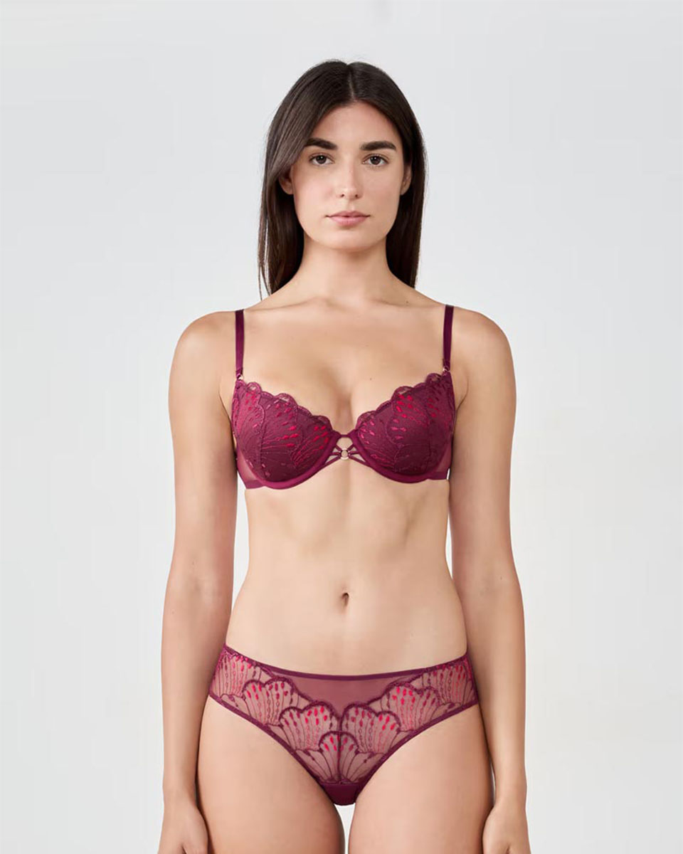 This bra with lightly lined cups naturally shapes the chest. It features delicate embroidery and scalloped edges.