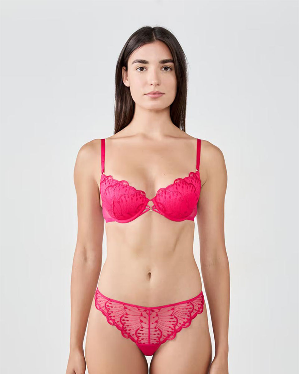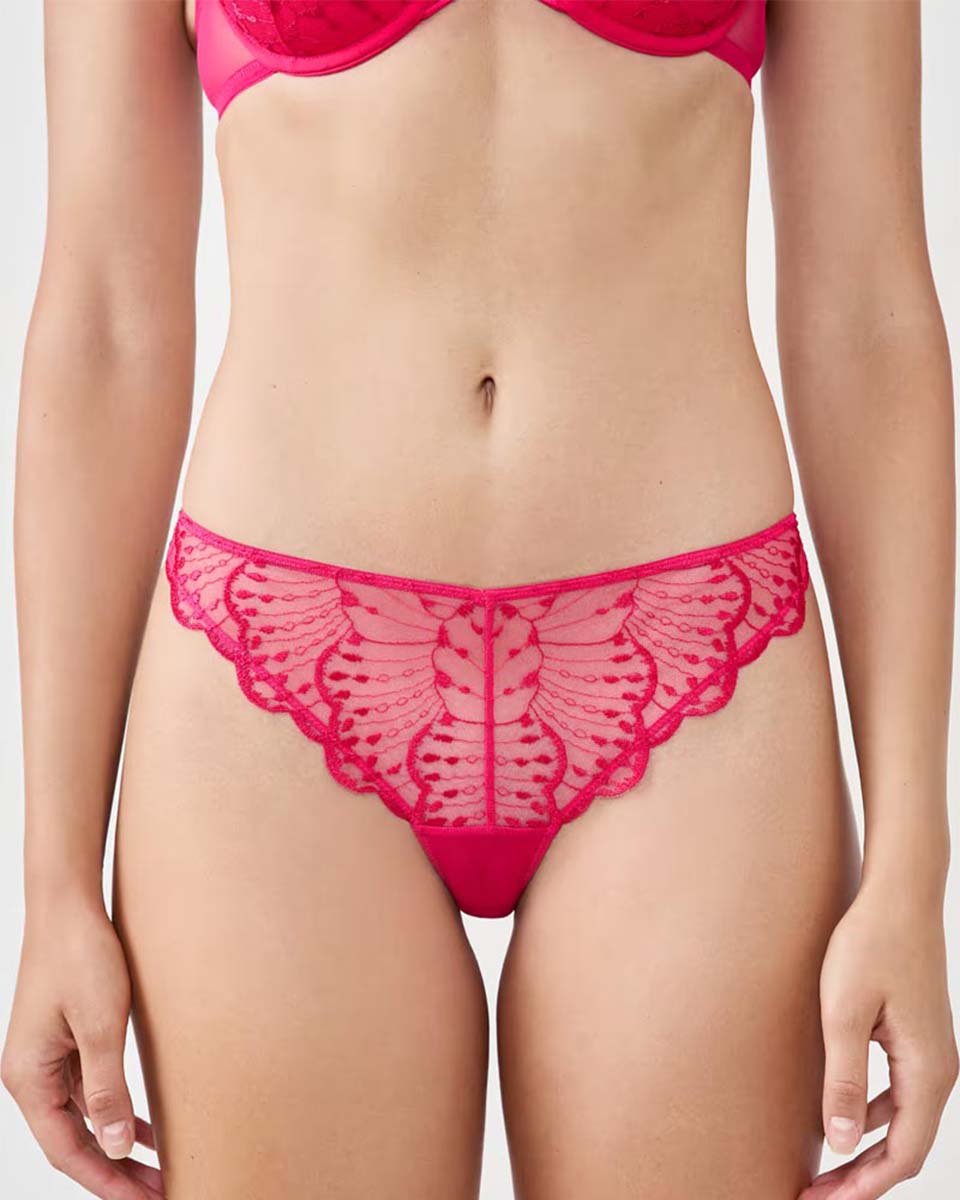 This tanga in transparent tulle is adorned with floral embroidery. It is enhanced with scalloped edges.