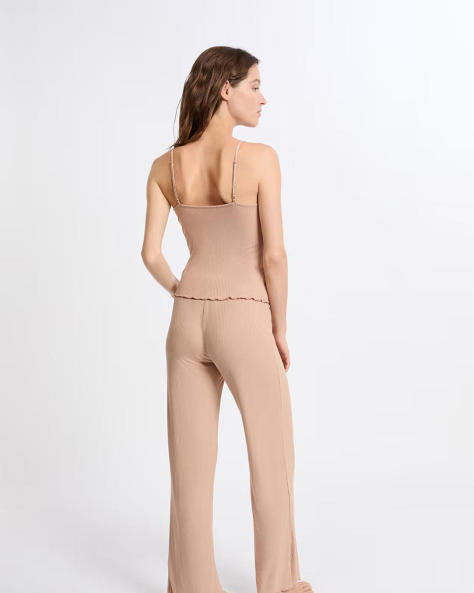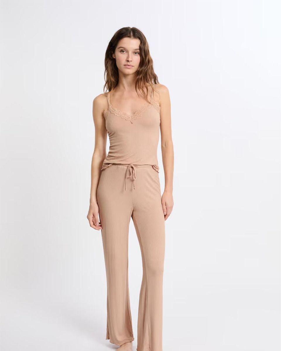 “Ideal for soft and cozy nights, this pajama set is made of soft knit fabric. It features a camisole with scalloped lace trim and flowing pants with a tie waist.”