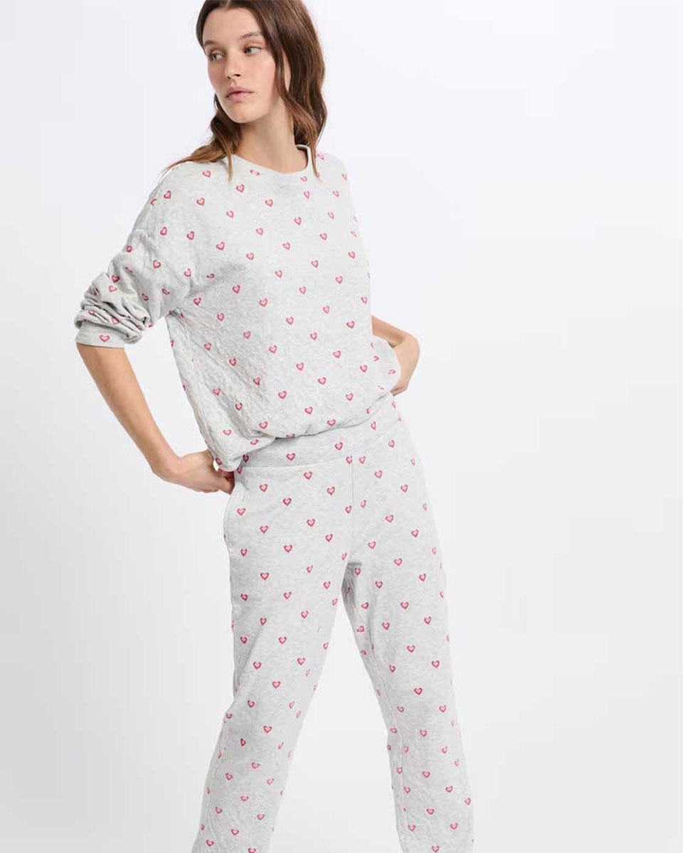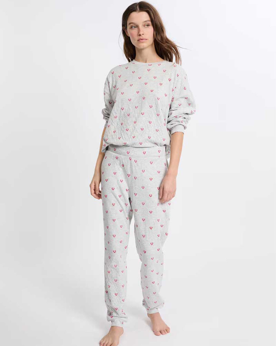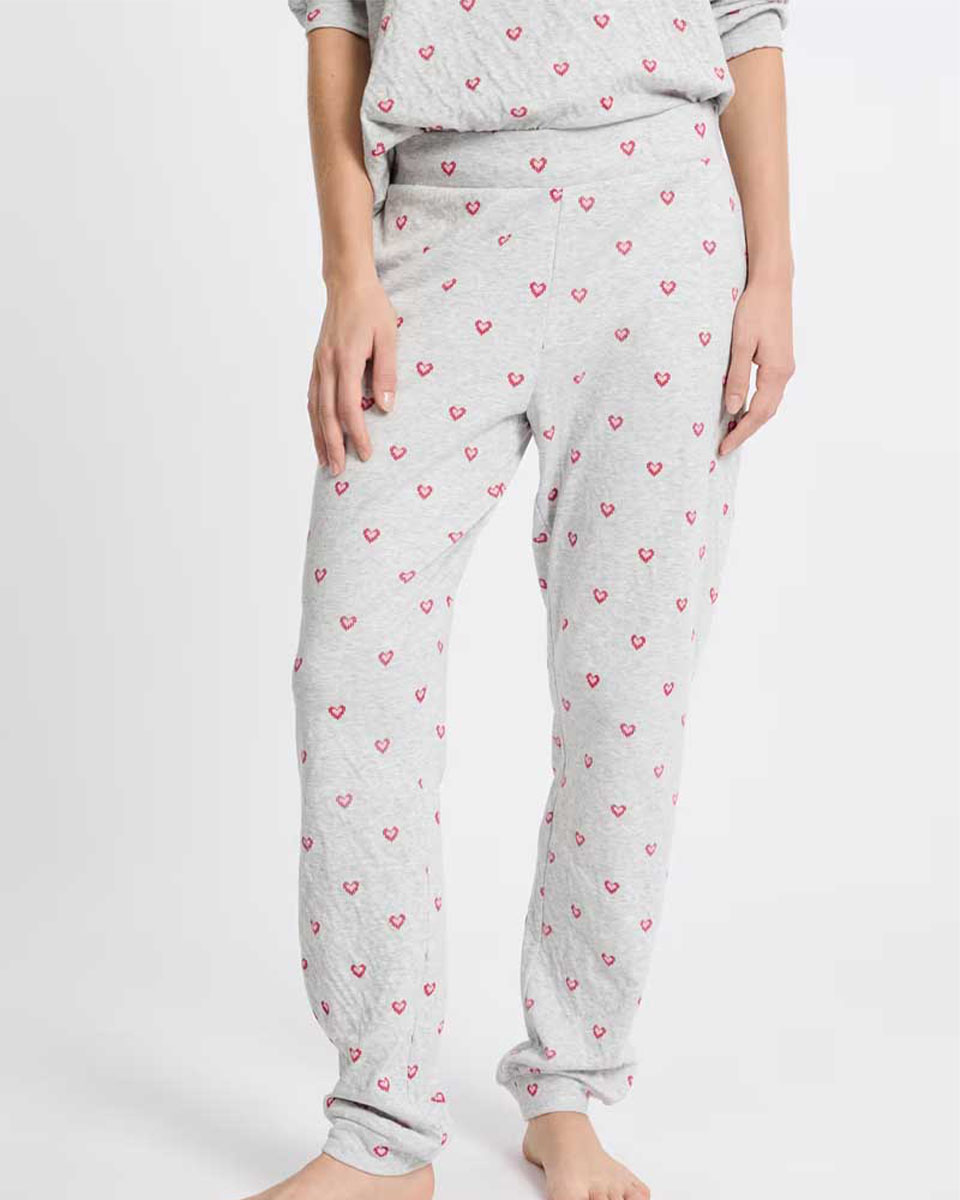 These pyjama pants are made of cotton. They feature a heart print and pair with the matching t-shirt.