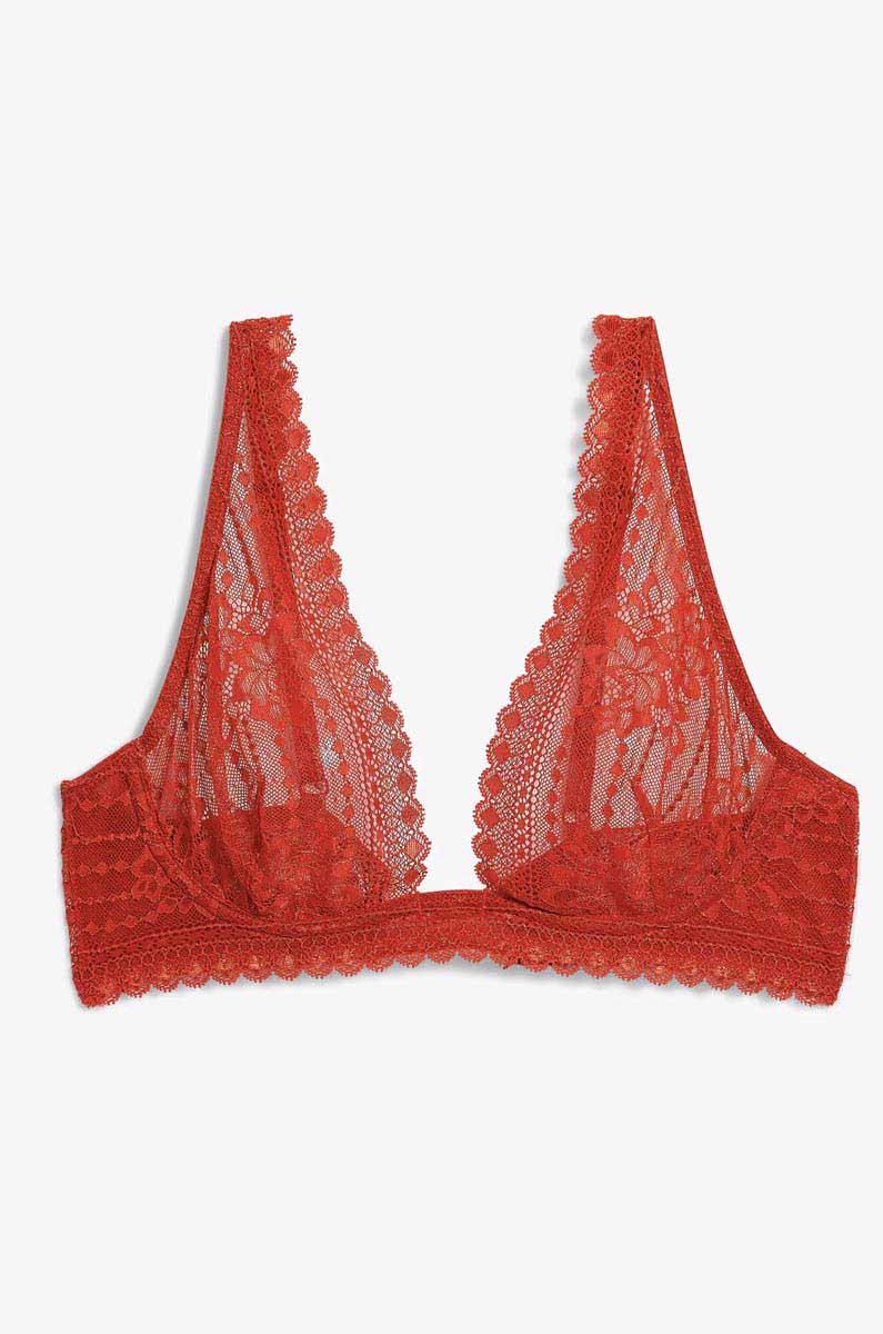 An ultra-lightweight and comfortable new shape for an enhanced cleavage: this underwired triangle bra will make a splash in your lingerie drawer. Its discreet and comfortable underwiring offer excellent support, while the form-fitting lace continues up to the shoulders. Bralette No. 7: Triangle-style Lace Unlined Underwiring Adjustable straps Back-fastening hooks Our model is 1.80m tall and is wearing a size 90B.