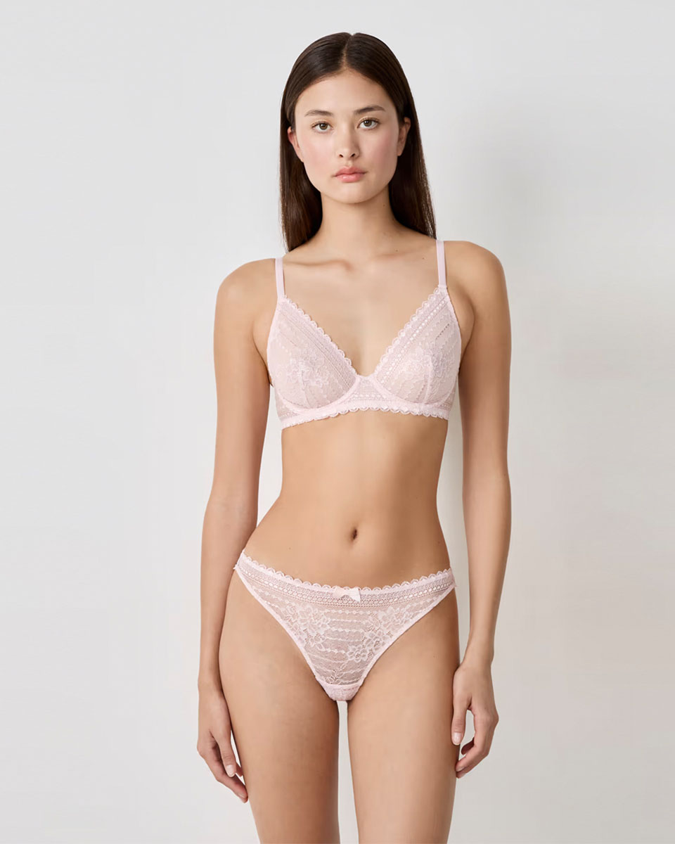 “Let the lace reveal your skin in this delicately floral tanga.Prefer push-up or triangle? Discover all the matching bras and create your set.”
