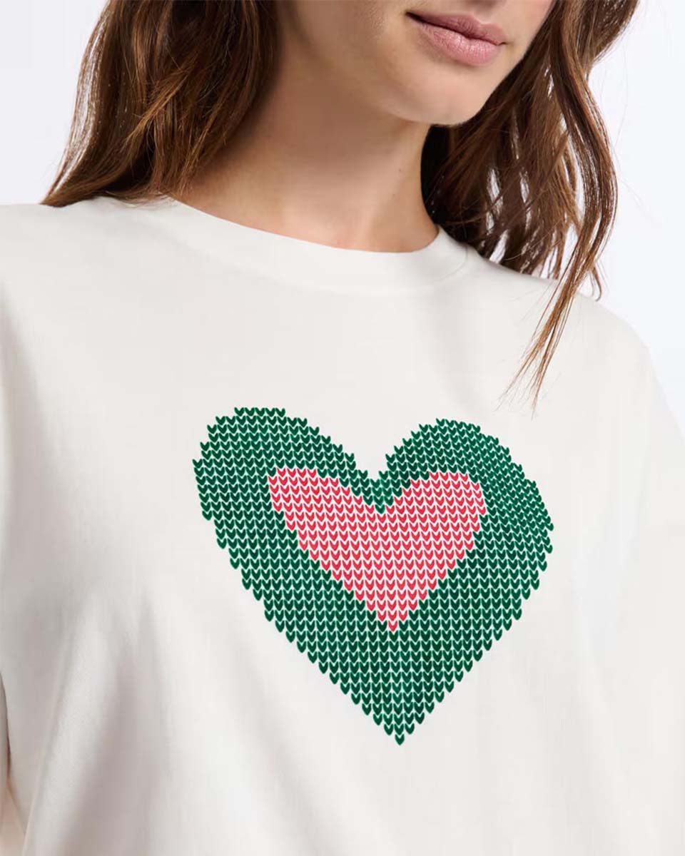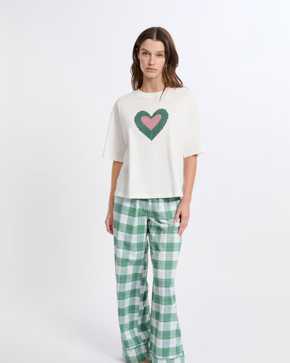 “Easy to style, this pajama t-shirt features short sleeves and a round neck. Made from cotton, it has a heart print.”
