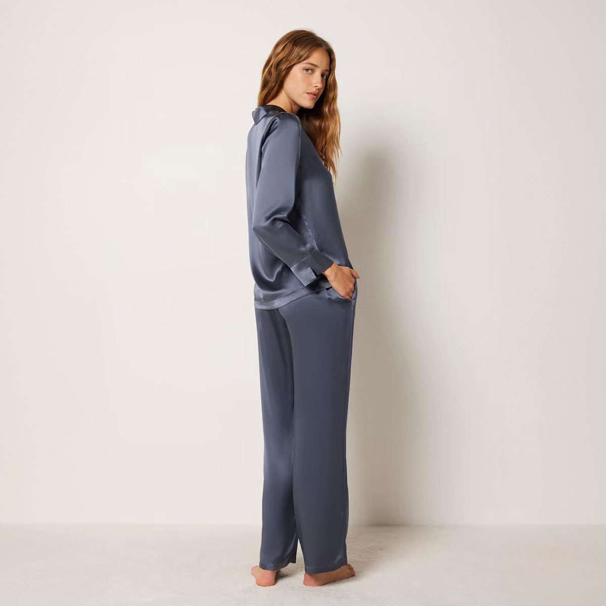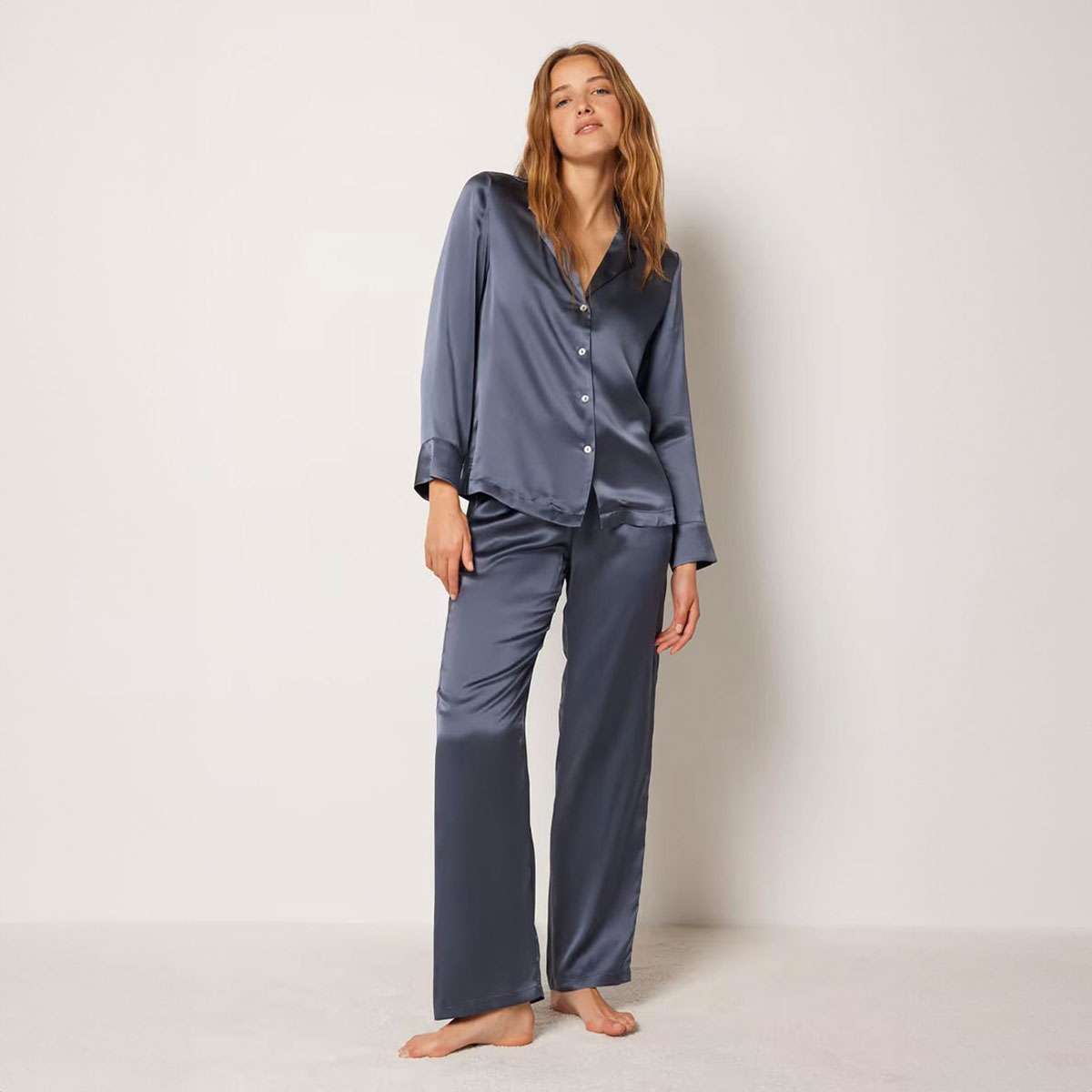 Fluid and light, this silk pajama shirt reveals a sublime neckline while promising soft and chic nights.