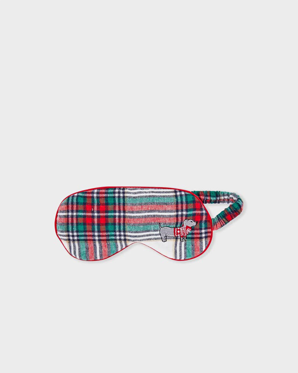 “Ideal for soft and comfortable nights, this cotton sleep mask features a checkered pattern and a dog print detail on the side.”