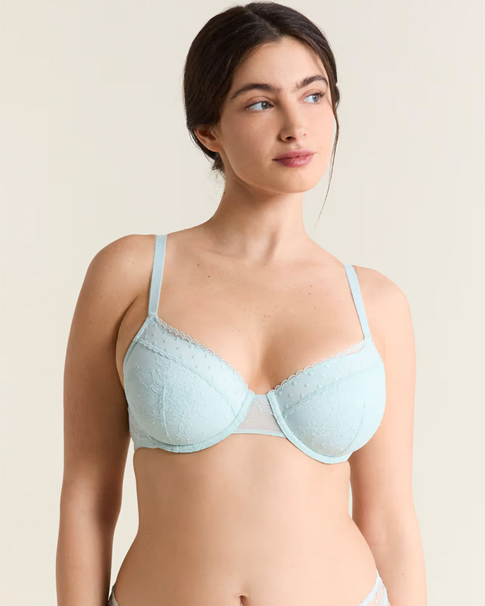 “BACK LINING (D/E/F cups) : 90.00 % Polyamide, 10.00 % ElastaneCUP LINING : 100.00 % PolyesterLACE : 89.00 % Polyamide, 11.00 % ElastaneEMBROIDERY : 66.00 % Polyester, 34.00 % Polyamide”