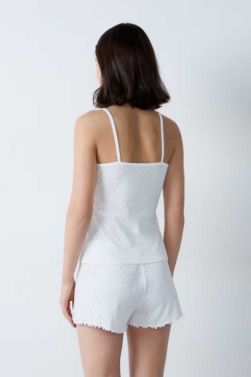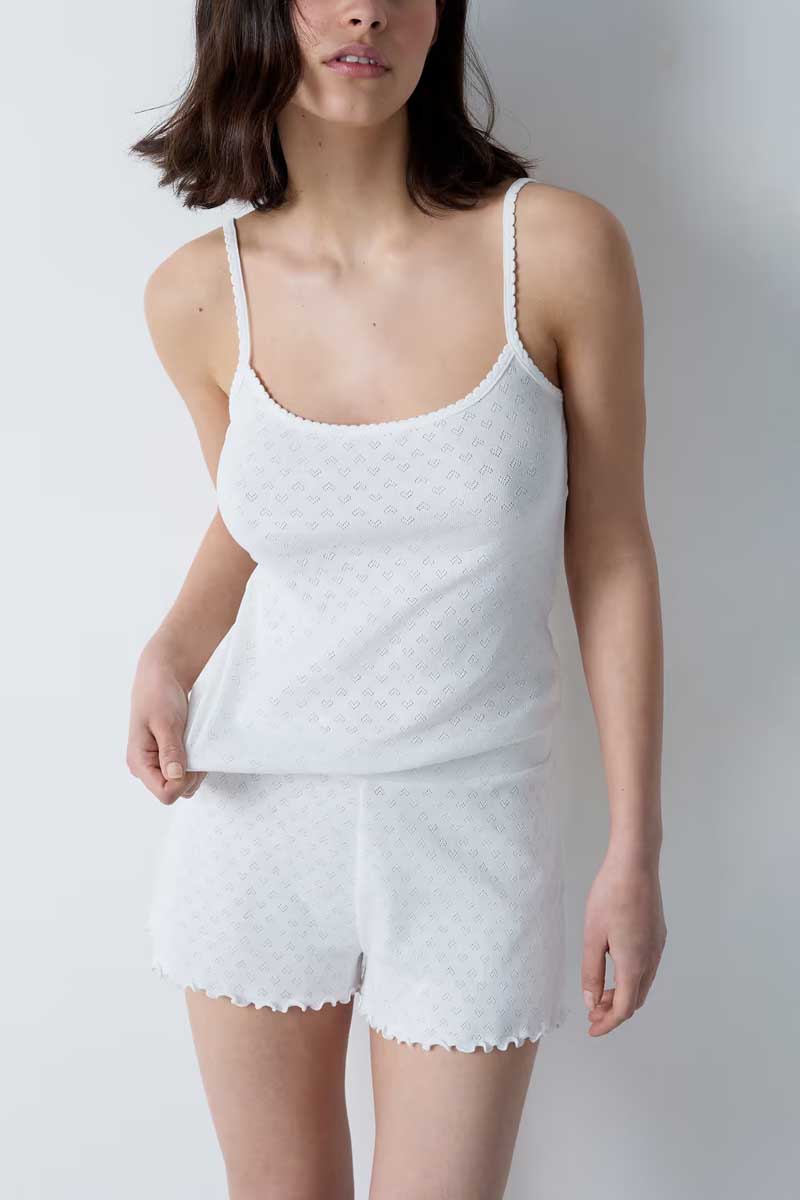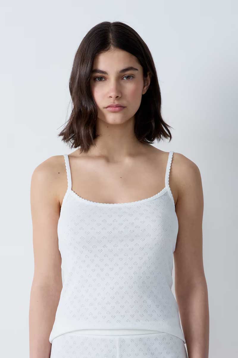“The perfect cotton camisole for everyday comfort. With its pointelle knit, square neck, and thin straps, it’s a must-have for any nighttime wardrobe.”
