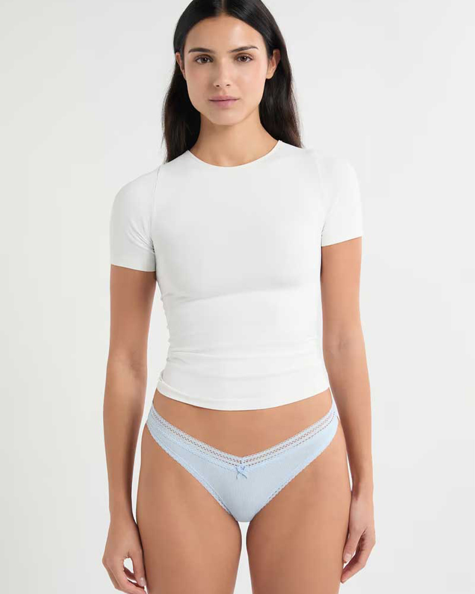 “Made from soft material, this thong combines comfort and softness. It features a scalloped edge and a small bow at the top.”