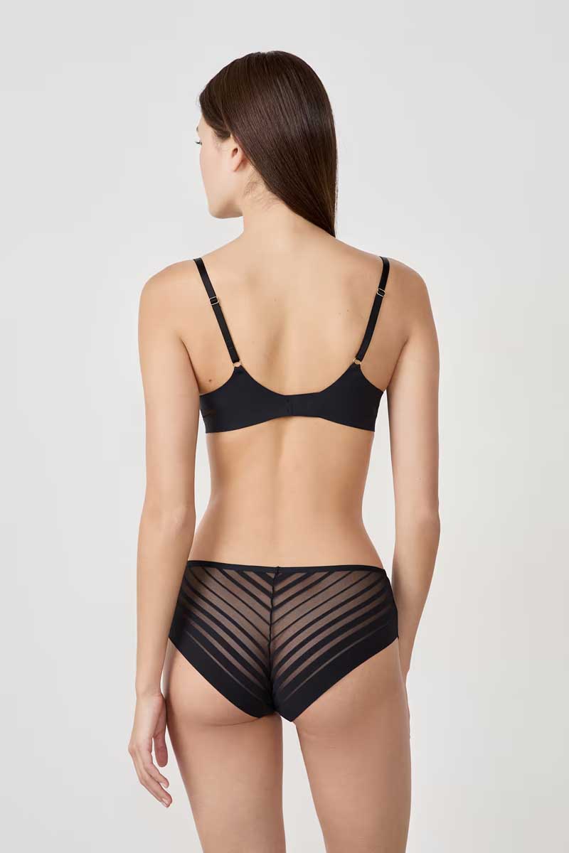 “Invisible and irresistibly couture, this new collection in matte and shiny microfiber makes no compromises.Featuring push-up cups and underwire, this bra offers a boosted, plunging neckline. Combining comfort and sensuality, its ultra-flat back construction makes it discreet and perfect under any clothing.”
