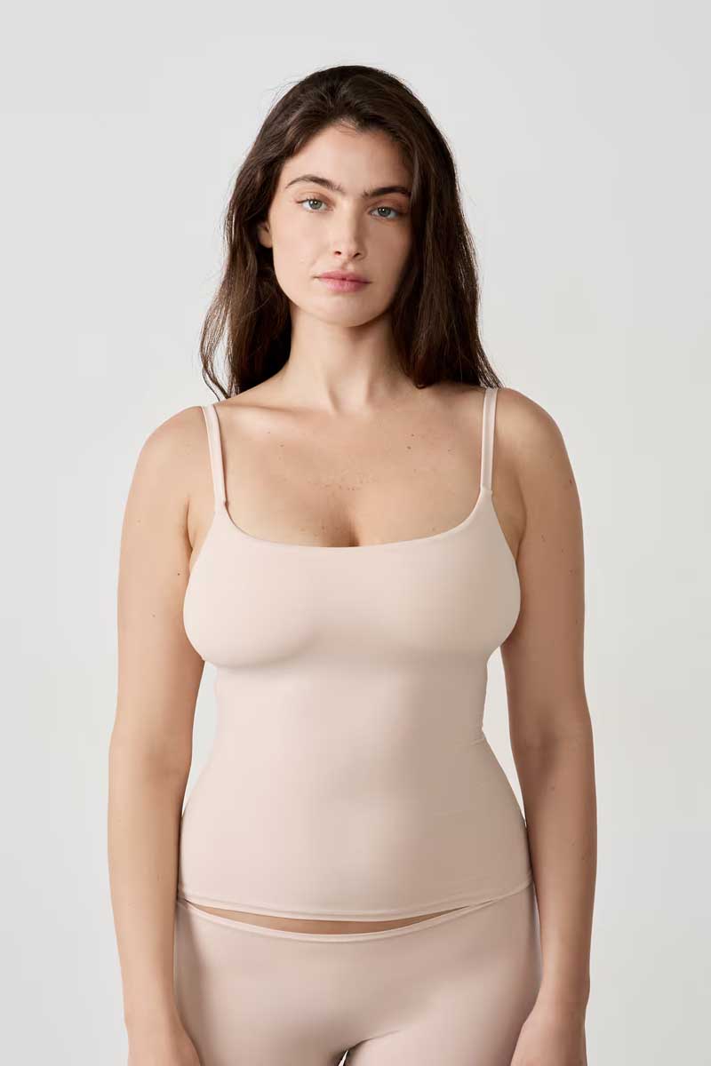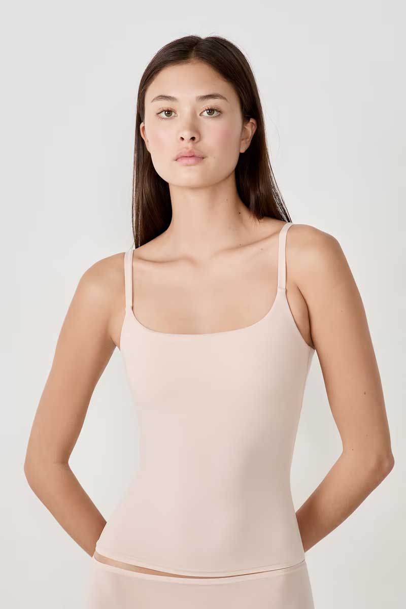 “No bra. New feel.Ultra soft, ultra stretchy, ultra invisible, discover Pure Soft, a no bra sensation collection.Halfway between underwear and clothing, it’s designed to be worn day and night, under and over. Pieces with fashionable, minimalist cuts, designed to fit the body, in an ultra soft, ultra stretchy, ultra invisible material.A new way of thinking about lingerie.Made from a second-skin material, soft and invisible, this microfiber camisole can be worn as a top or lingerie. Featuring a built-in bra and removable pads, it offers a comfortable no bra effect, while its thin adjustable straps adjust to your desires. Ultra stretchy, it hugs your curves and enhances your silhouette.”