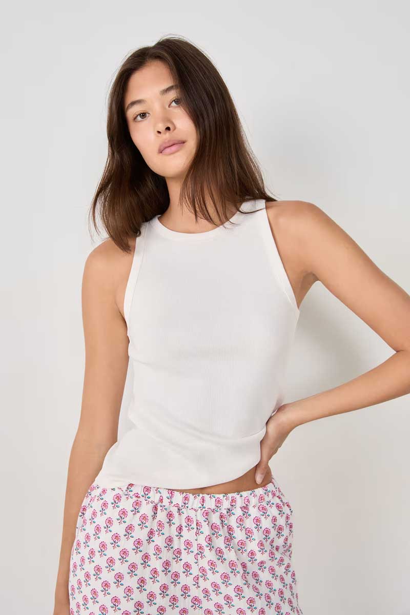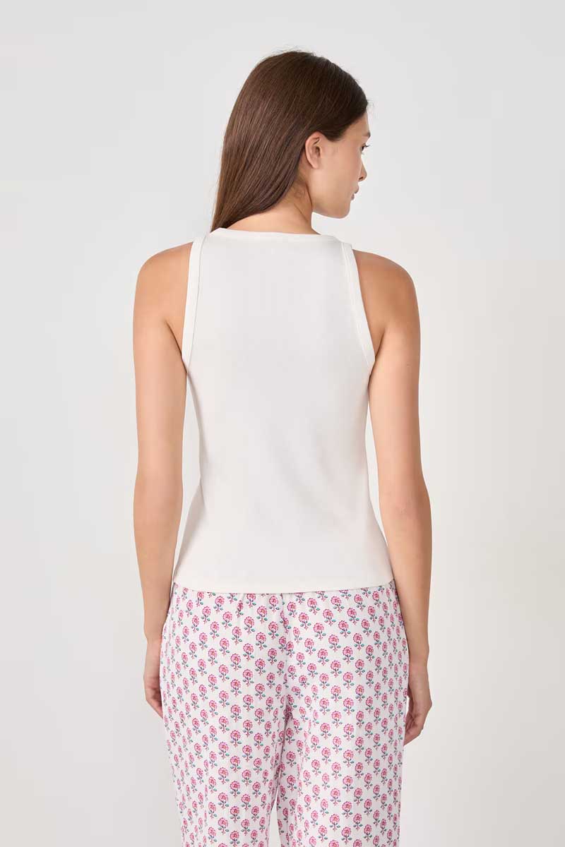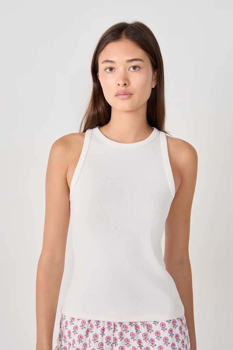 This tank top combines comfort and style thanks to its ribbed fabric and crew neck. It can be worn under a flowing linen shirt or on its own during the summer heat.
