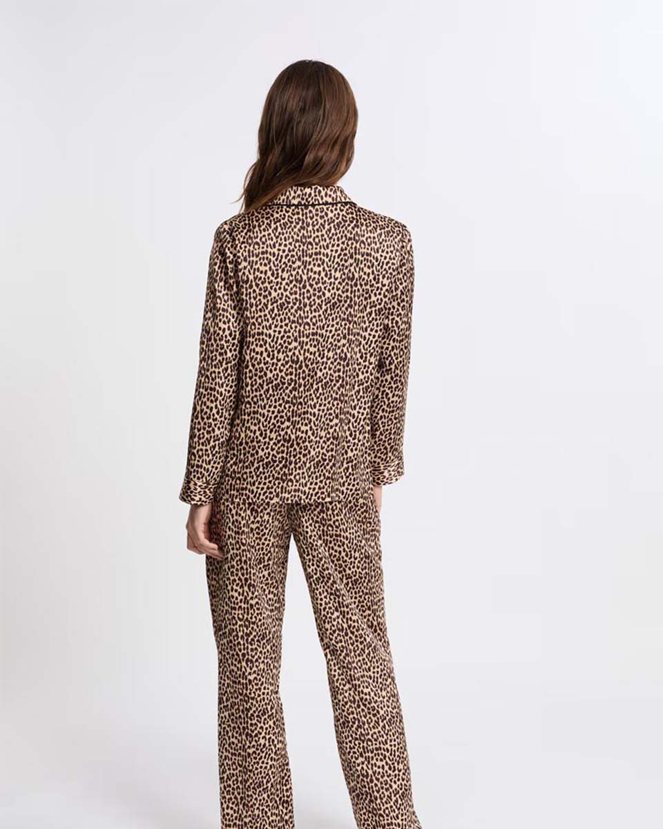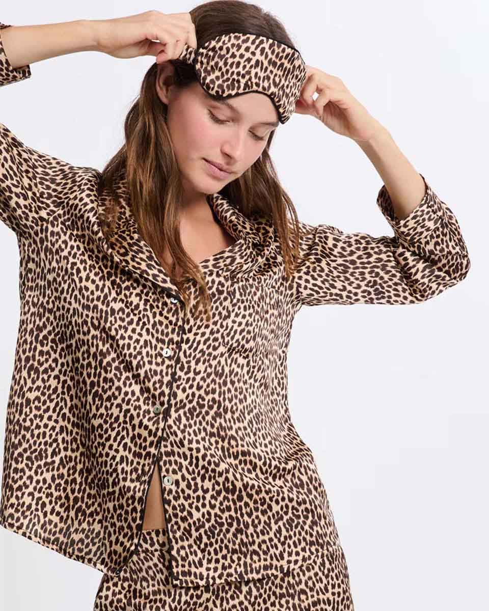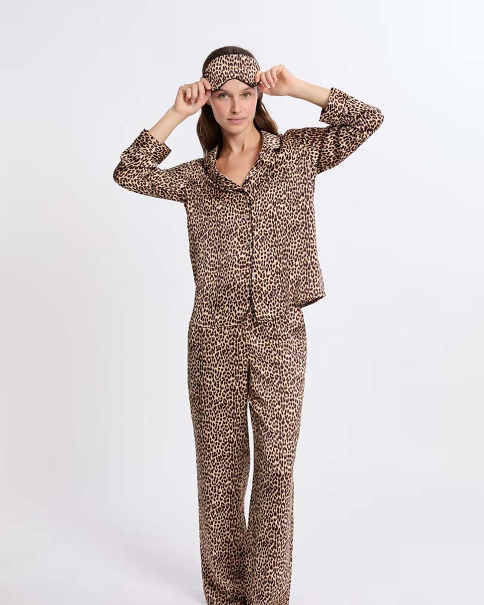 “Featuring this season’s trendiest print, this two-piece pajama set boasts a leopard pattern.It includes a sleep mask, a long-sleeved shirt, and flowing pants with a satin finish.”