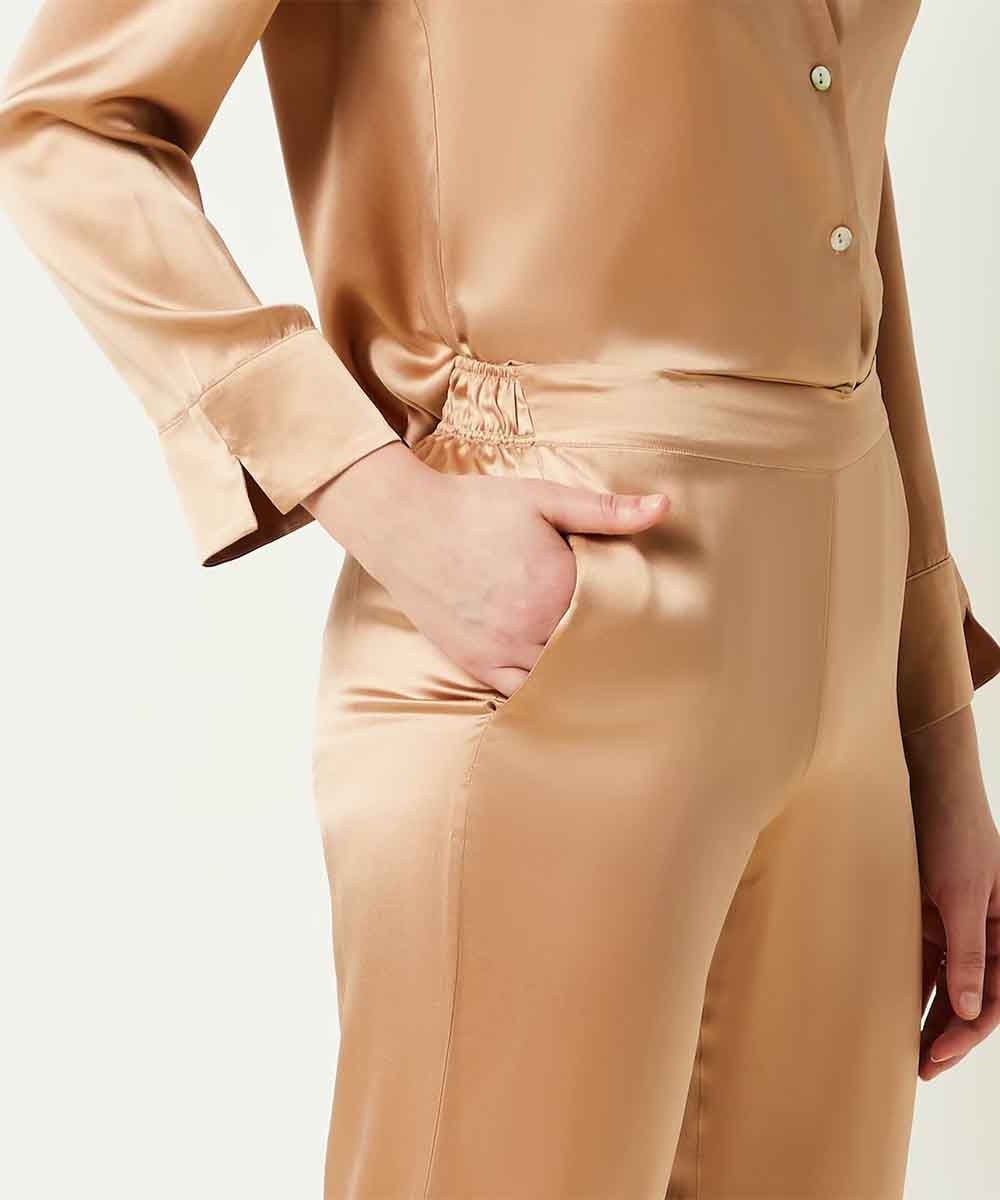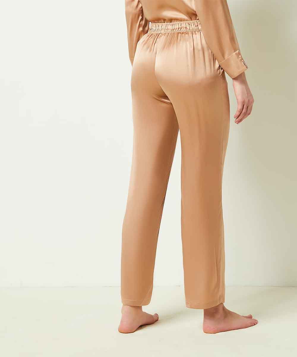 “A precious and infinitely soft material for a very chic night. Fall in love with our 100% natural silk collection, which has exceptional thermal properties: it keeps you warm in winter and cool in summer. These soft silk pants can be worn as a total look at night. Pajama pants 100% natural silk Straight cut pants Elastic waist 2 pockets”