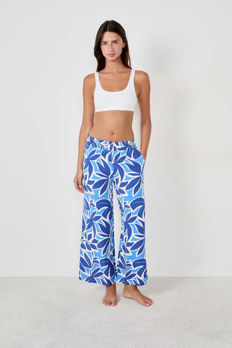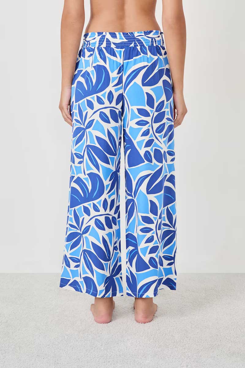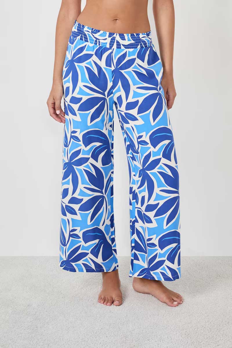Tropical prints blend with the fluidity of these flared-cut trousers. Their smocked waist adjusts perfectly to your curves. Practical, they reveal front pockets.