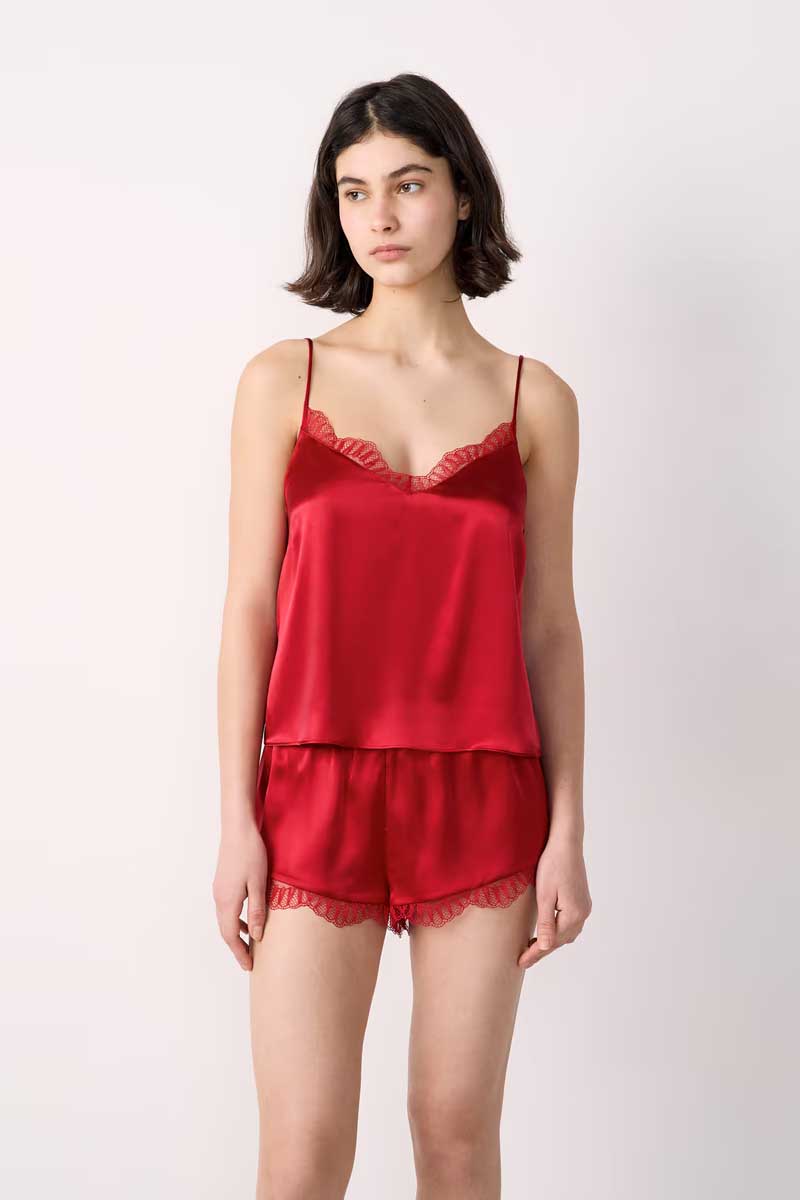 “This season, our silk collection is reinvented with new shades and shapes.Infinitely soft, this camisole with thin adjustable straps reveals a V-neckline trimmed with lace and a delicately open back. To complete the set, add the matching shorts.”