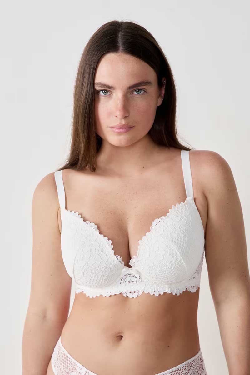 “A naturally enhanced neckline. The thin cups of this bra reveal a pretty curve surrounded by our iconic floral lace, Success.”