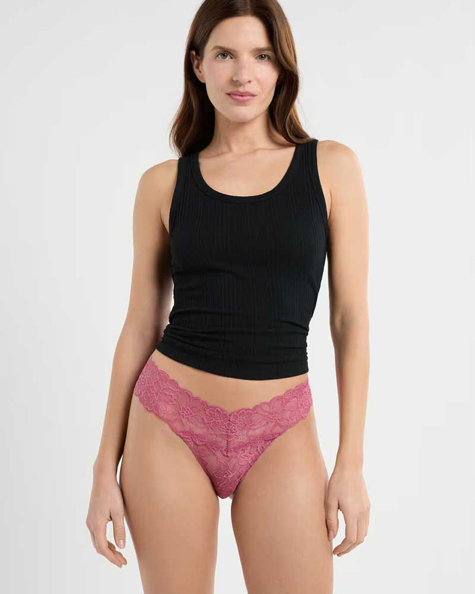 This tanga is dressed in fine and delicate lace. It features scalloped edges.