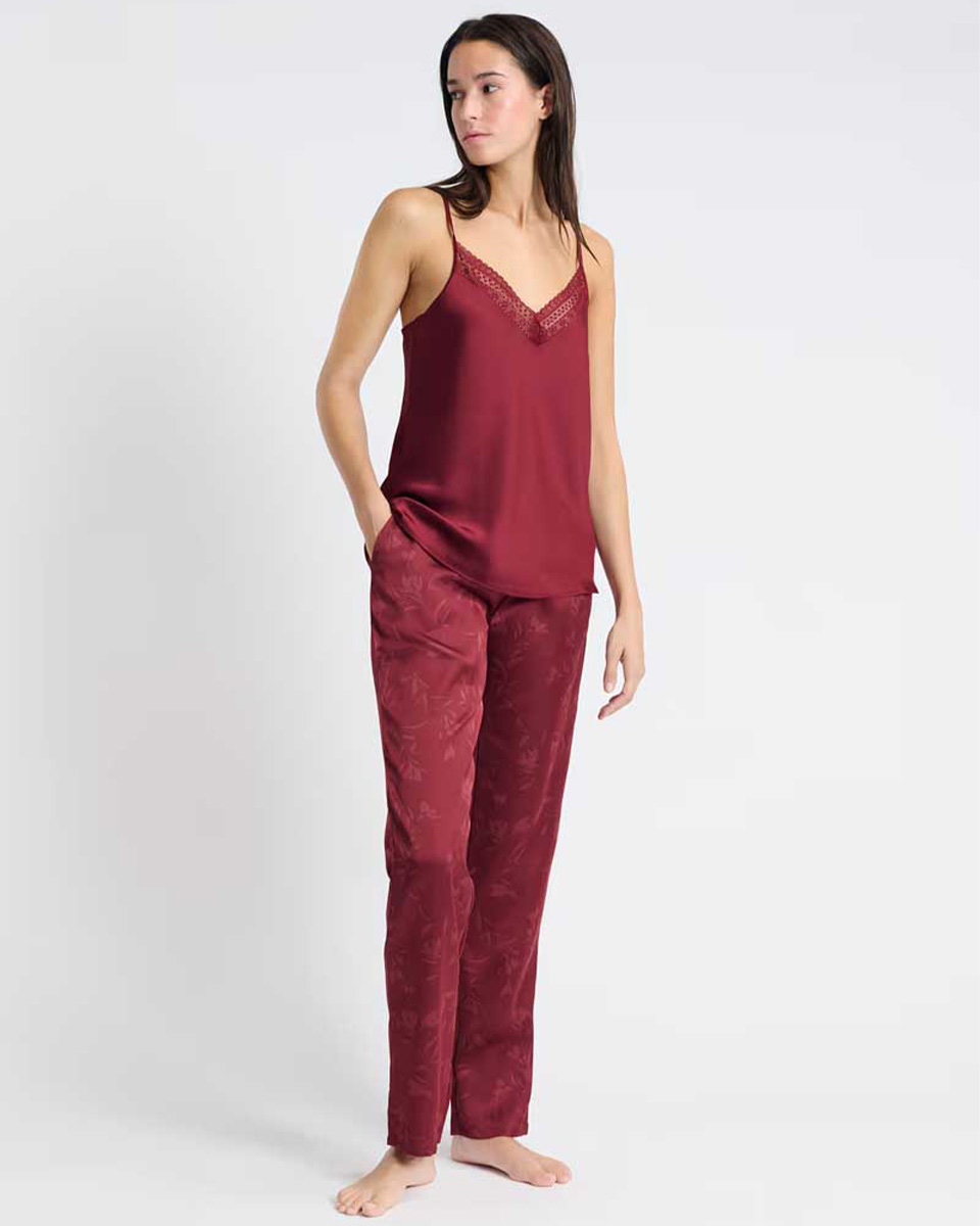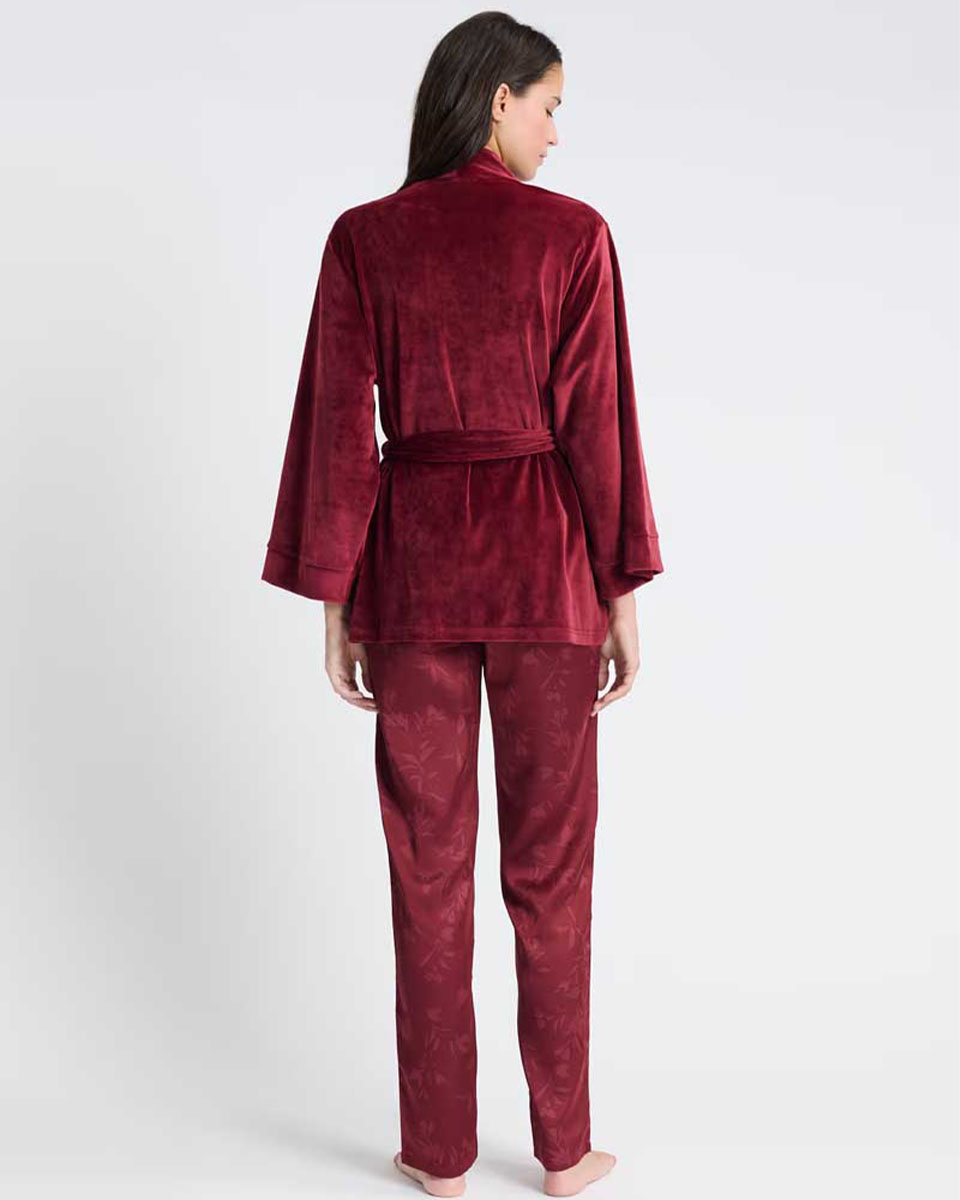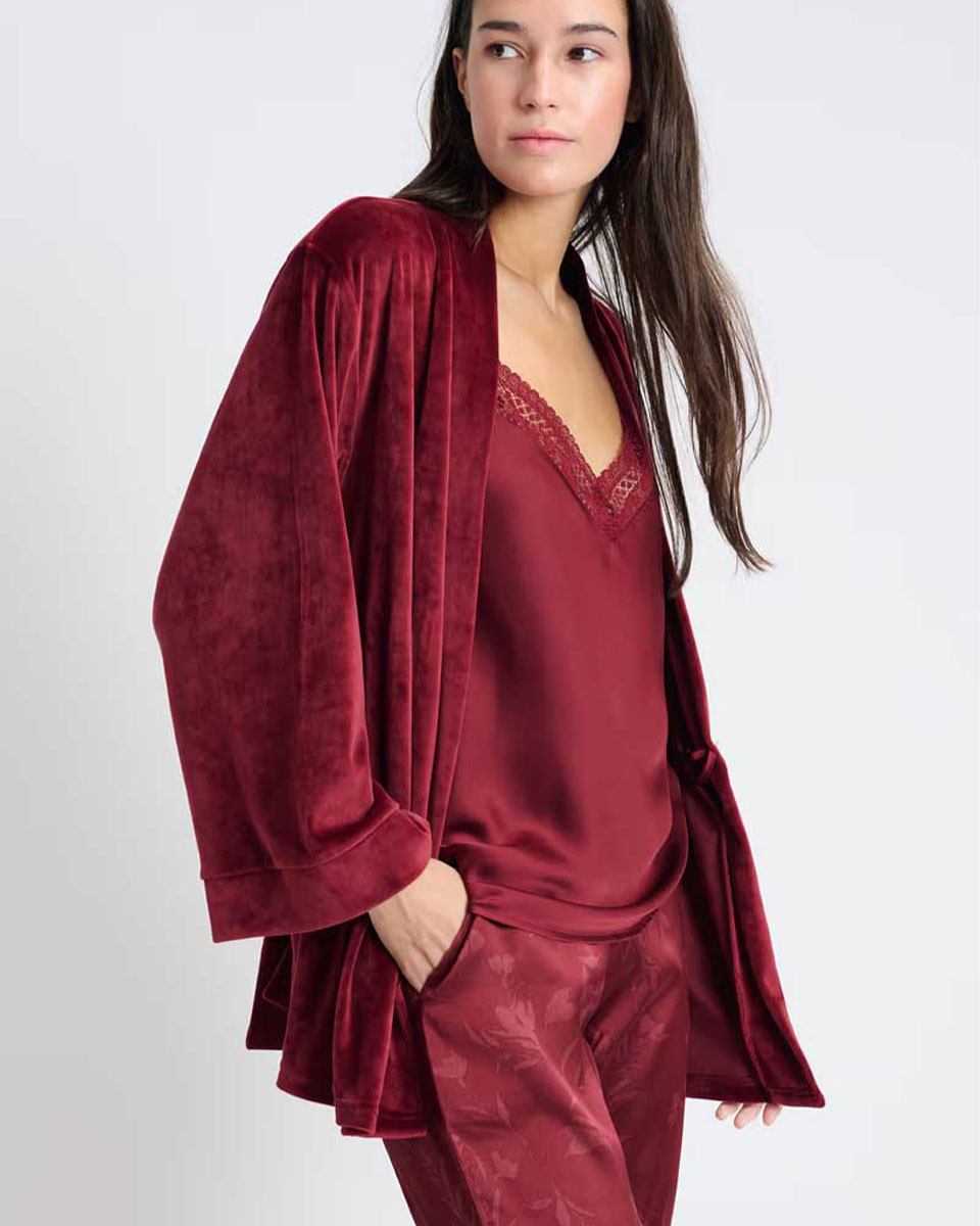 “Ideal for soft and cozy nights, this pajama set includes a camisole, pants, and a robe.With a satin finish and floral print, the camisole with scalloped edges pairs perfectly with the matching pants.They are complemented by a belted velvet dress.”