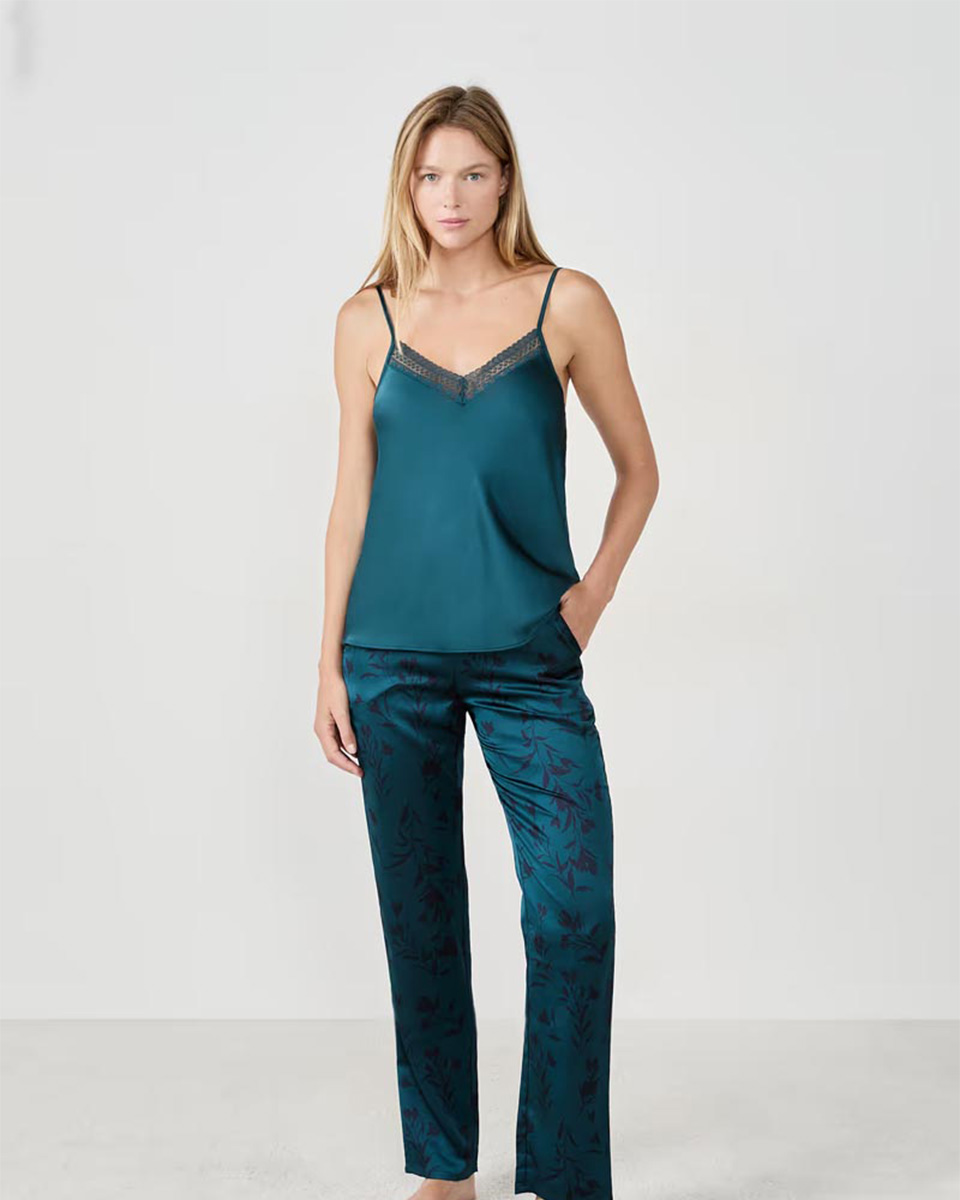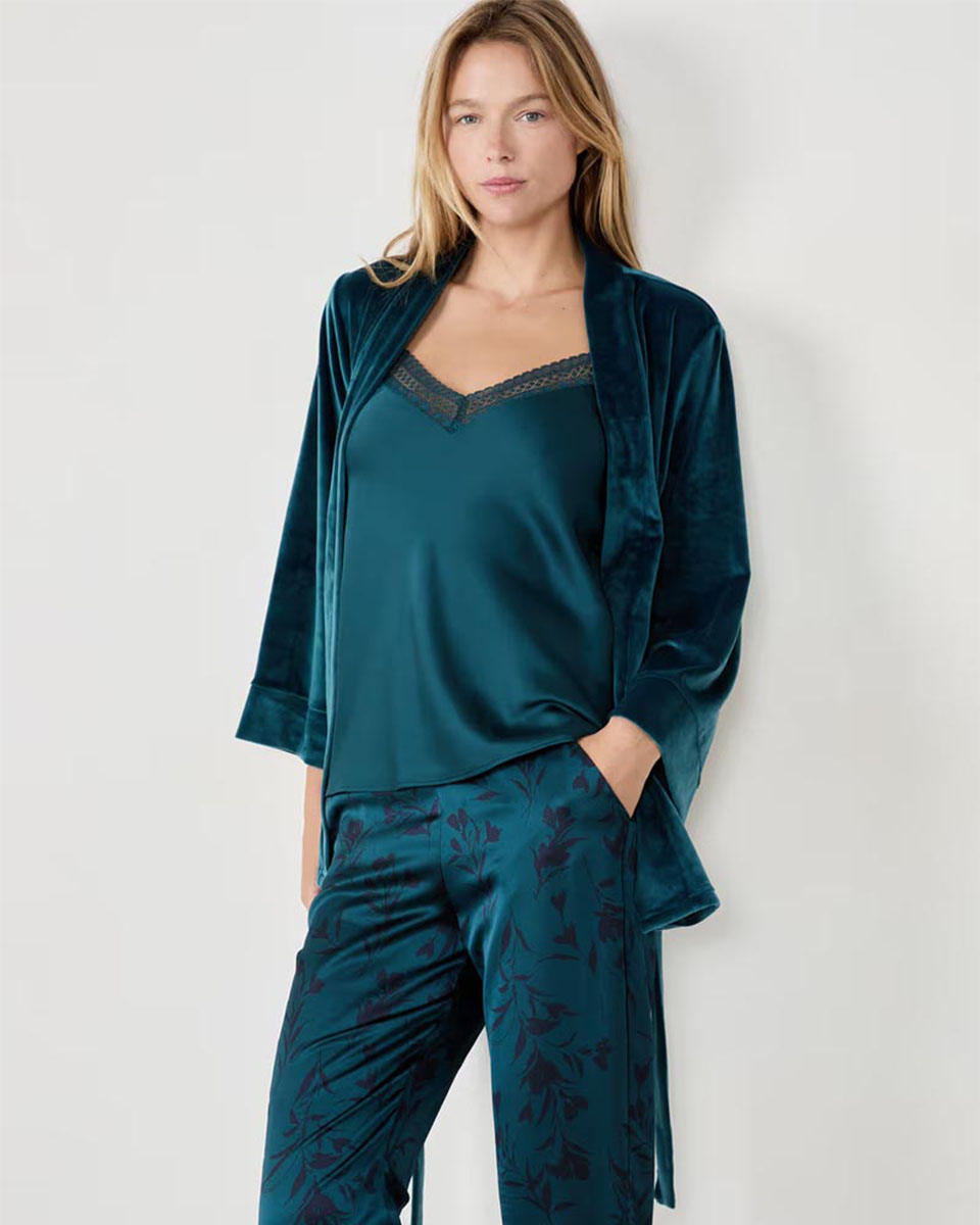 This 3-piece pyjama set offers a satin finish and spotted pattern. It features trousers and a camisole with a fluid cut as well as a velvet robe.