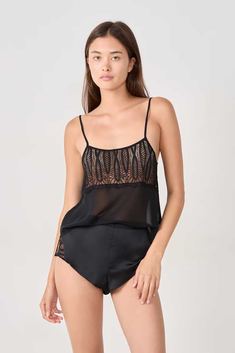 This delicate sheer voile camisole features a refined embroidery at the top. Its thin straps and round neckline accentuate the silhouette with lightness and elegance.