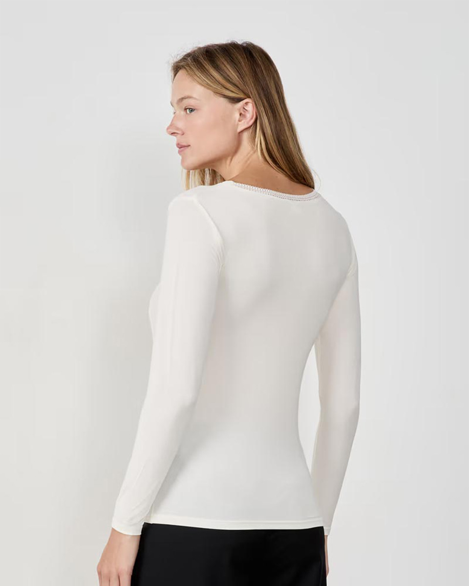 “An essential wardrobe staple, Etam unveils its new soft and ultra-comfortable line.Made from a soft fabric, this long-sleeved t-shirt features subtle sheerness and a second-skin effect. It’s embellished with a brand-new, modern, graphic lace. Wear it alone or under your sweaters; it provides warmth up to 3C.”