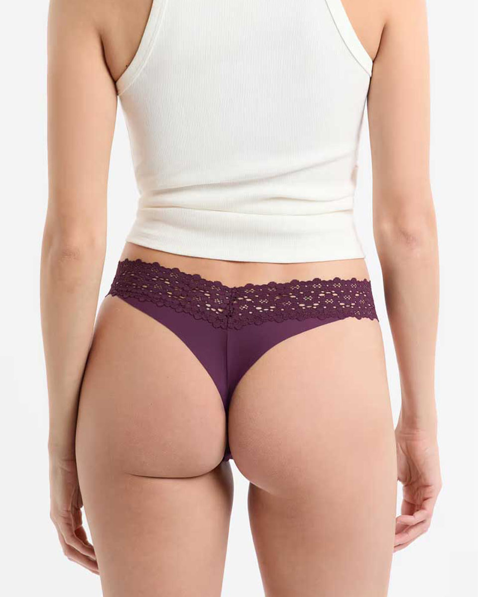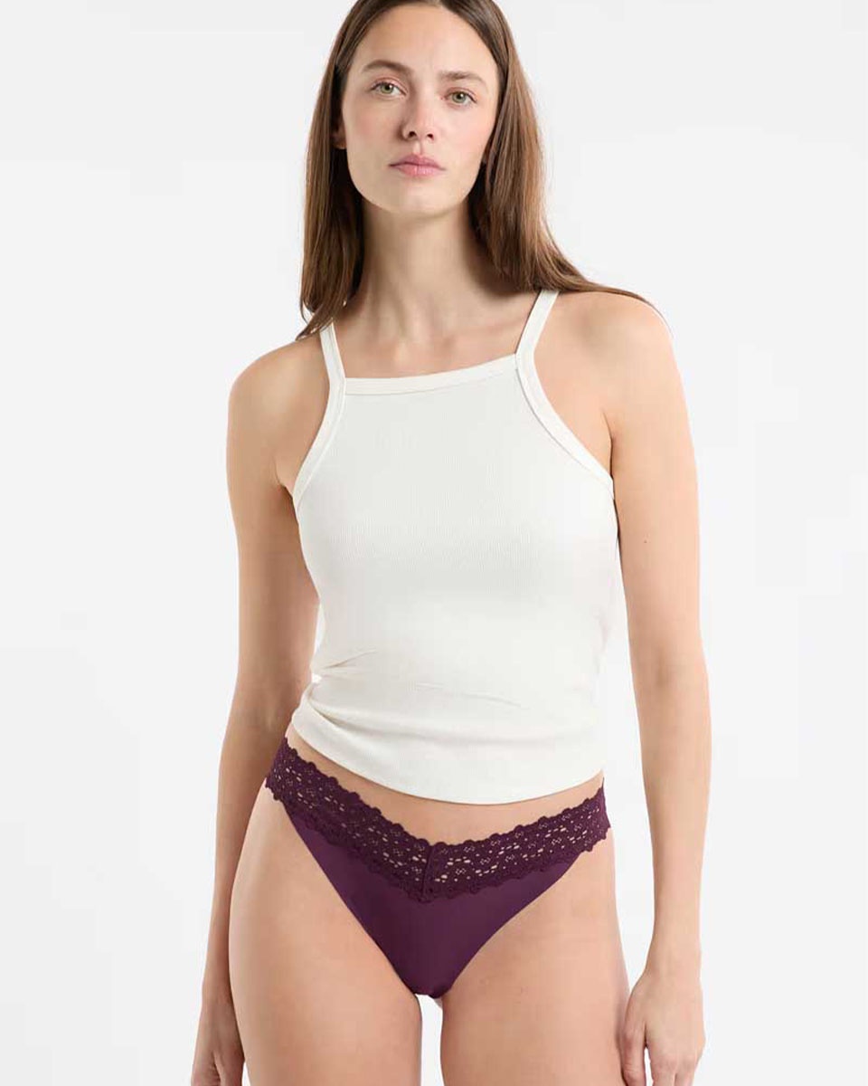 “With its high-cut design, the thong gives a rounded effect to all buttock shapes. We love this version delicately trimmed with lace.”